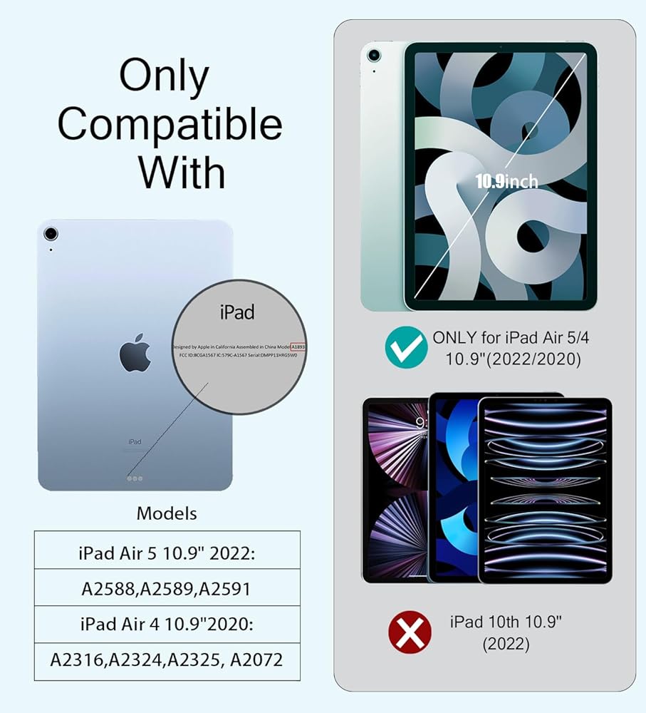 • [يناسب فقط iPad Air 10.9/Air 11 بوصة] - متوافق مع iPad Air 11 بوصة الجيل السادس 2024 M2، iPad 10.9 5th/4th gen 2022/2020، رقم الموديل: A2902 A2903 A2904 A2588 A2589 A2591 A2316 A2324 A2325 A2072. غير متوافق مع موديلات iPad الأخرى.