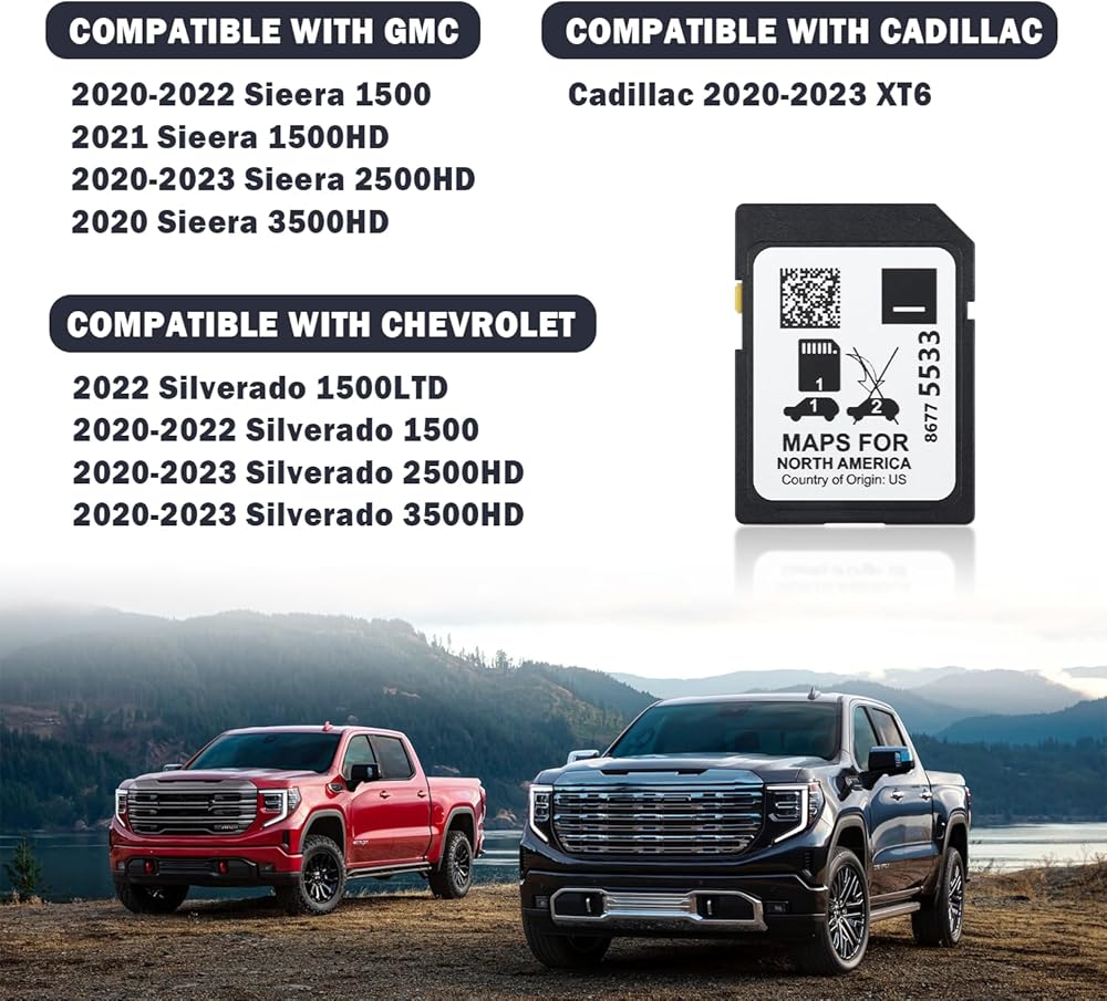 🌎 Compatible Models - This car gps navigation SD cards is compatible with GMC 2020-2022 Sieera 1500, 2021 Sieera 1500HD, 2020-2023 Sieera 2500HD, compatible with Chevrolet 2022 Silverado 1500LTD, 2020-2022 Silverado 1500, 2020-2023 Silverado 2500HD, 2020-2023 Silverado 3500HD and is also compatible with Cadillac 2020-2023 XT6.