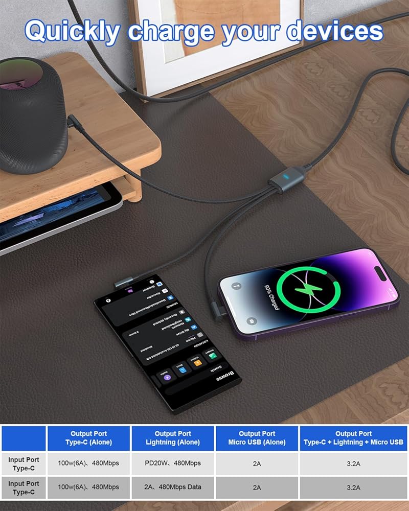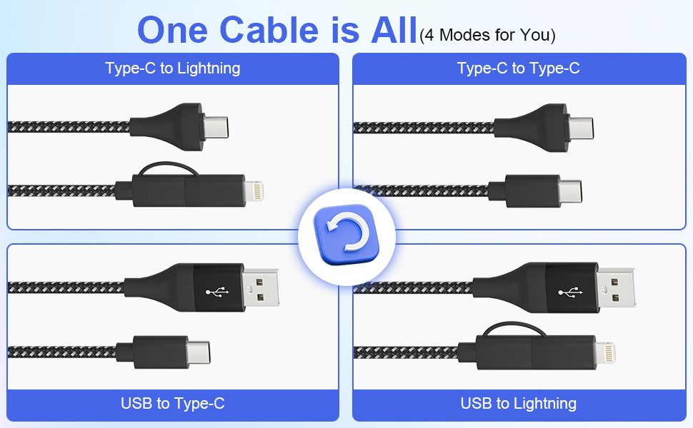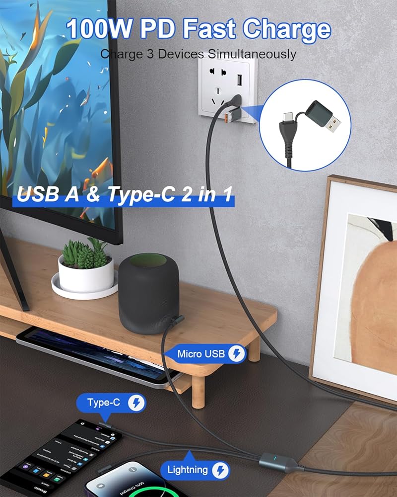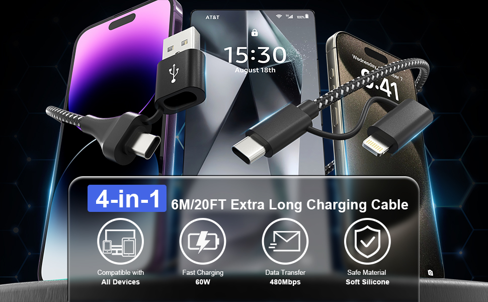 كابل شحن متعدد 4 في 1: يجمع كابل usb c بطول 20 قدمًا بين أربعة منافذ في واحد، بما في ذلك USB A إلى USB C، وUSB A إلى Lightning، وUSB C إلى Lightning، وUSB C إلى USB C. استمتع براحة استخدام كابل واحد فقط لتلبية جميع احتياجات الشحن الخاصة بك