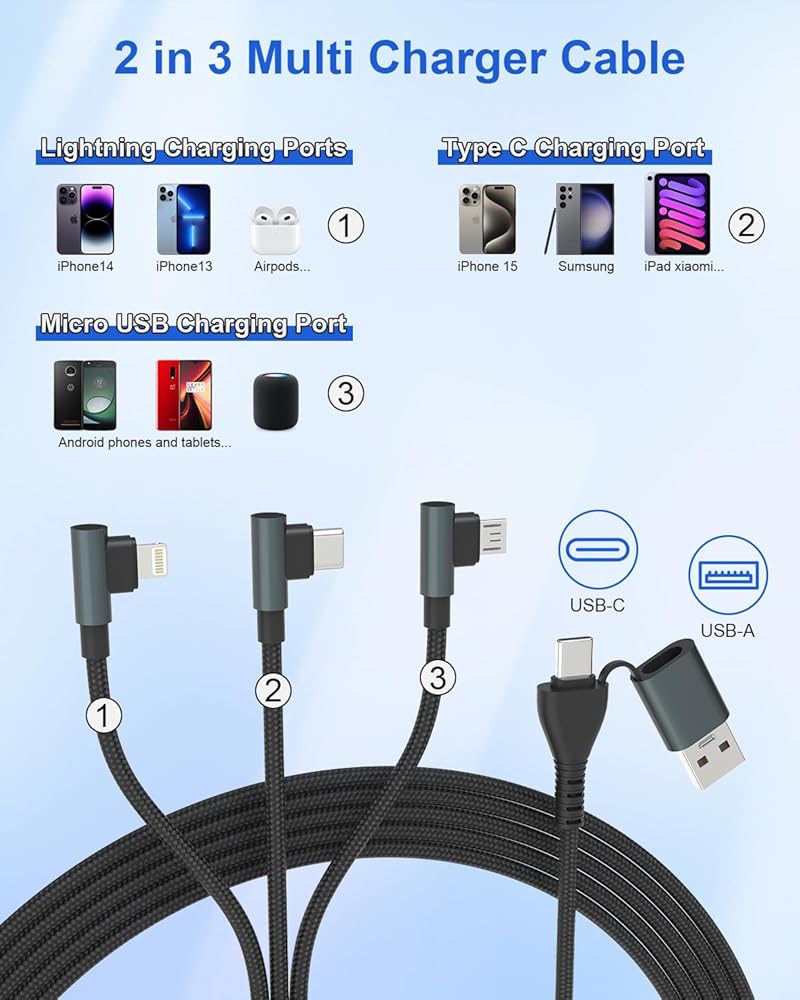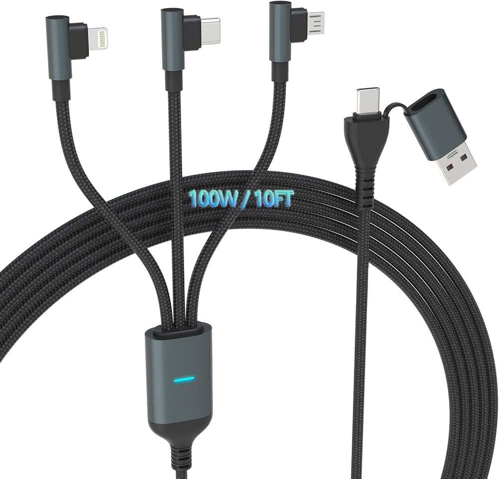 100W USB C Cable Multi Charging Cable 90 درجة - 10 قدم [Apple MFI معتمد] USB A +C لكتب C +Micro USB +Lightning Nylon Corner Universal Charger for iPhone 16 15 14/LAPAD/IPAD/هاتف محمول