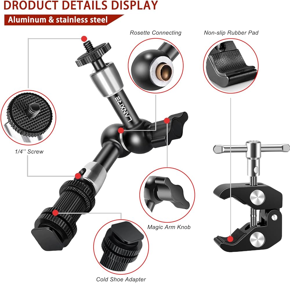 حامل مشبك الكاميرا خفيف الوزن ومريح للحمل في أي وقت وفي أي مكان. مثالي للتصوير الفوتوغرافي الداخلي والخارجي وتصوير مقاطع الفيديو مثل Vlog وYouTube أو TikTok. رأس كروي 360 درجة يسمح لك بتعديل الزوايا بحرية.