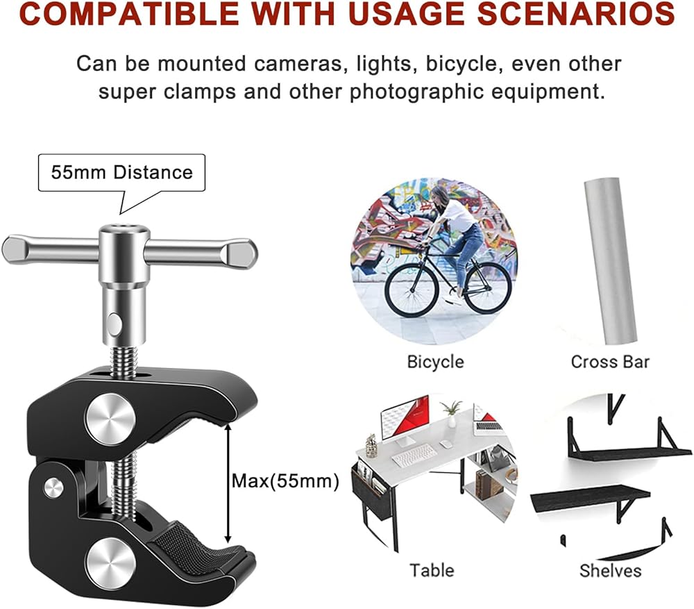 نطاق فتح الفك بمشبك فائق هو 15 مم - 55 مم. يمكنك تركيب أشياء بسمك أقل من 55 مم مثل الكاميرات والأضواء والمظلات والخطافات والأرفف والألواح الزجاجية والقضبان المتقاطعة وما إلى ذلك. الوزن الصافي لمشبك المشبك هو 0.28 رطل أو 129 جرام.
