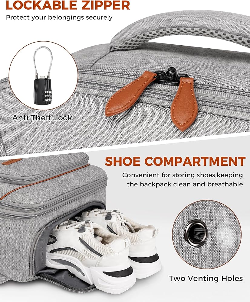 سهولة تعبئة الأمتعة: تشتمل حقيبة الظهر المخصصة للطائرات على مكعبين لتعبئة الملابس وحقيبة مقاومة للماء لمستلزمات النظافة، مما يساعدك على تنظيم أغراضك بسهولة. كما أنها تحتوي على حجرة منفصلة للأحذية في الأسفل. الحجرة واسعة بما يكفي لتناسب مقاس 10-12 حذاء لكل من الرجال والنساء، والتي يمكن أيضًا استخدامها كحقائب أدوات الزينة أو لأغراض أخرى. فتحتان للتهوية في حجرة الأحذية لضمان التهوية