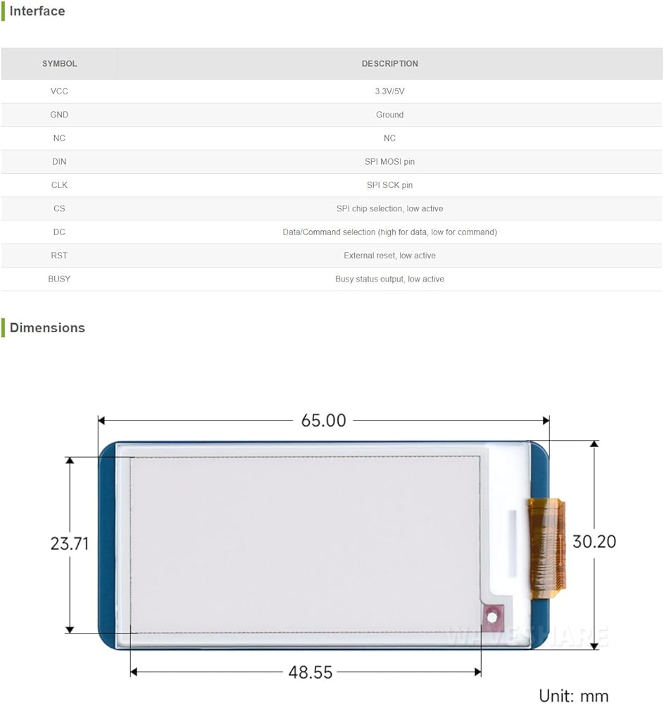 • The 2.13 inch e-paper with SPI interface, for connecting with other controller boards like Ardui/Nucleo, etc.