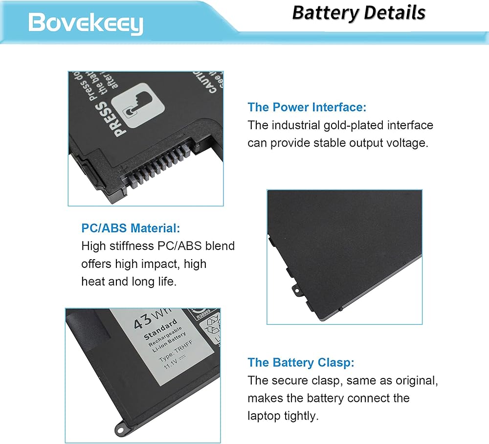 【تفاصيل البطارية】- البطارية البديلة dell TRHFF هي اسم الموديل: بطارية ليثيوم أيون قياسية قابلة لإعادة الشحن من النوع TRHFF؛ نوع البطارية: ليثيوم أيون؛ الجهد: 11.1 فولت؛ السعة: 41 وات في الساعة؛ الحالة: جديد؛ العمر الافتراضي: حوالي 300-500 تفريغ لكل دورة شحن.