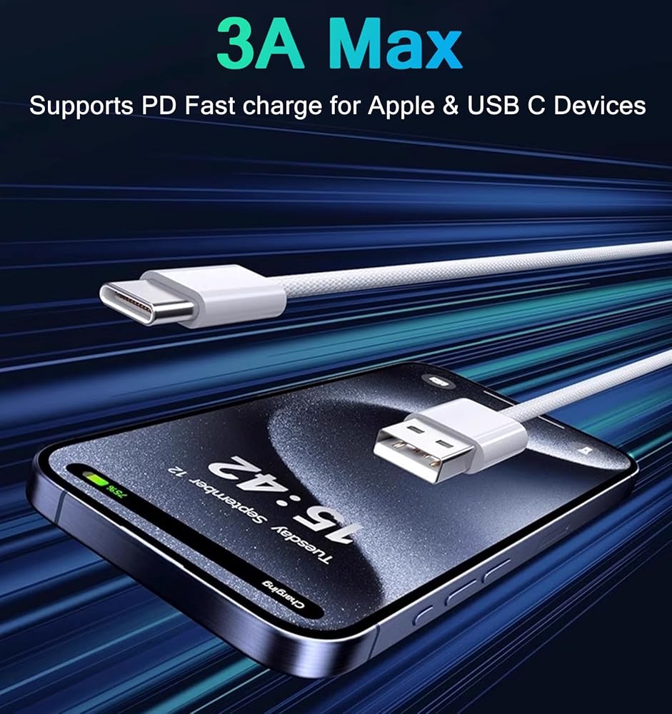 【IN THE BOX】: 1 x 3.3ft Nylon Braided USB C to USB A Charging Cable(White), Support carplay, charging your phone in car.