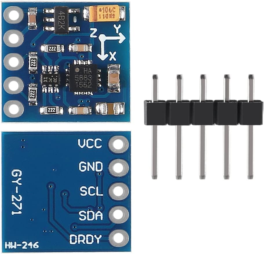 GY-271 QMC5883L 3-axis electronic compass module is designed for low-field sensing with a digital interface and it is perfect to give precise heading information. This compact sensor fits into small projects such as UAVs and robot navigation systems. The sensor converts any field to a differential voltage output on 3 axes.