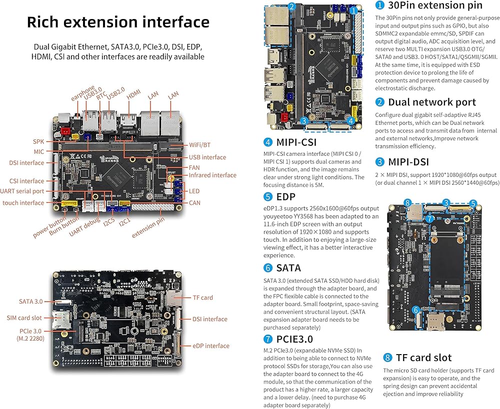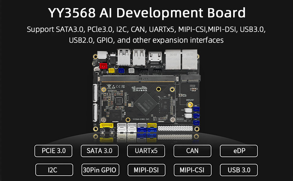 • [امتداد I/F غني] يوفر YY3568 Devkit ما يصل إلى 5 منافذ تسلسلية، و6 USB، و30Pin GPIO، وPCIE/CAN/I2C/DSI/CSI؛ لتلبية الاحتياجات المختلفة.