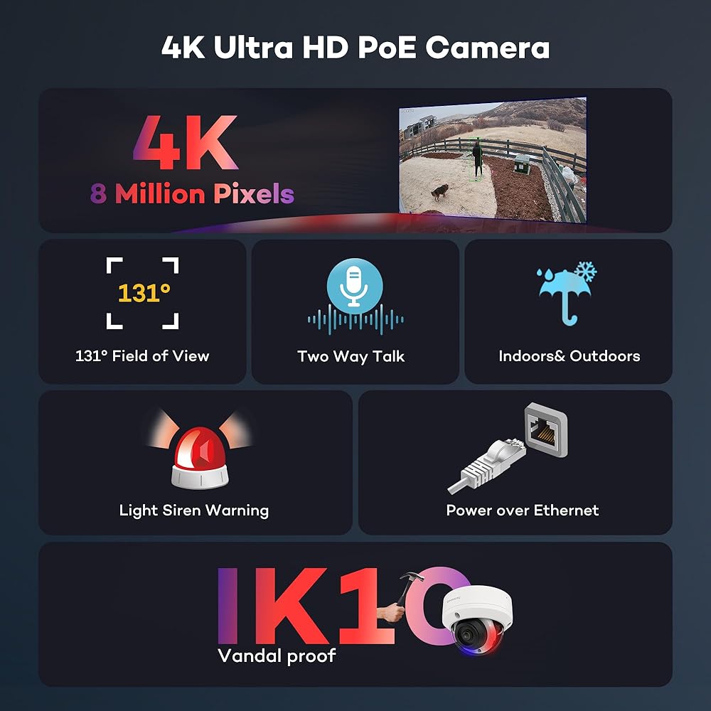 نظام كاميرا أمان ONWOTE 4K 16 قناة PoE، كشف المركبات البشرية للتعرف على الوجه بالذكاء الاصطناعي، التحدث في اتجاهين، رؤية ليلية ملونة، IK10 Vandal Proof، كاميرات PoE 16x 8MP PoE عرض 131 درجة، 16CH NVR للأعمال