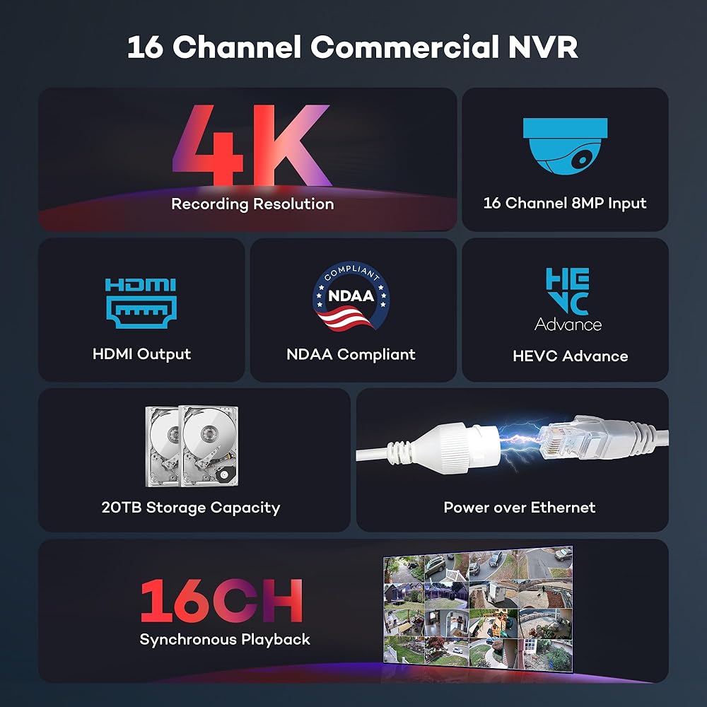 - 16CH 8MP NVR-- قرص صلب مدمج بسعة 4 تيرابايت، ومنفذين HDD يدعمان 20 تيرابايت.