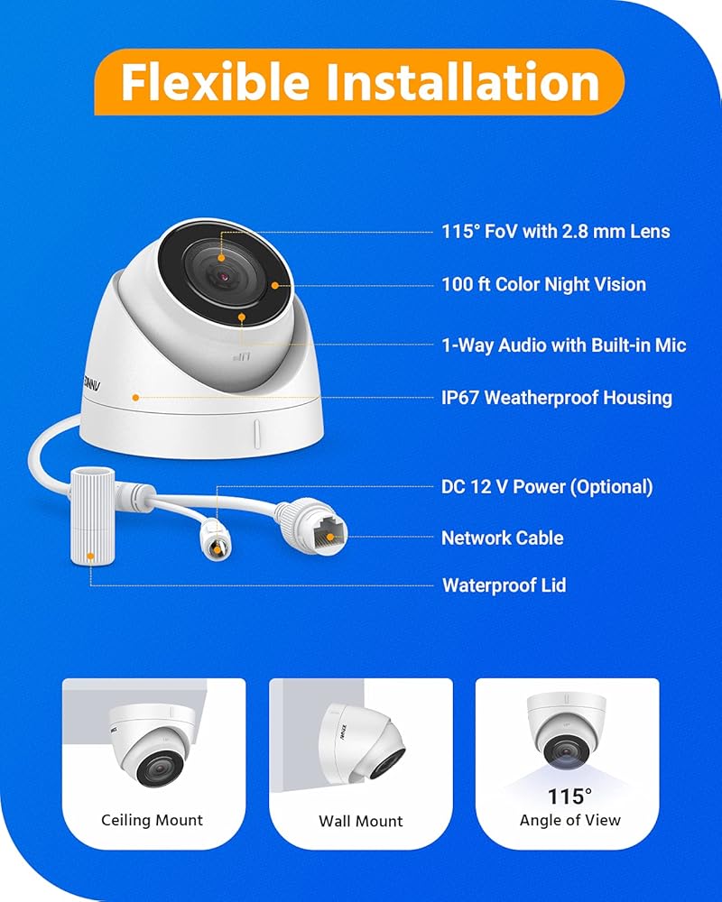 【إعداد PoE بسيط ومقاوم للطقس IP67】قم بتوصيل كاميرا PoE IP بأجهزة NVR فقط باستخدام كابل إيثرنت لنقل الطاقة والبيانات. يساعد الغلاف المقاوم للعوامل الجوية IP67 القابل للتكيف الكاميرا على الثبات في الظروف الجوية الصعبة. DIY التثبيت كما تريد.