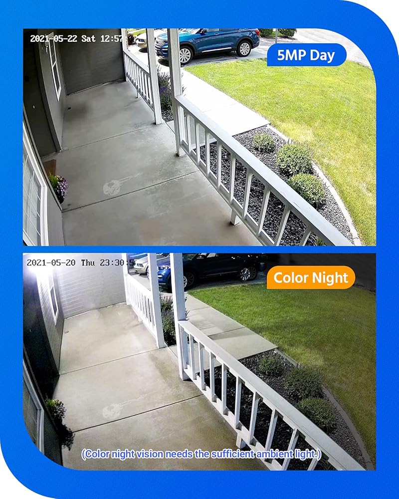 صورة حقيقية بدقة 5 ميجابكسل فائقة الدقة ليلاً ونهارًا، تلتقط كاميرا IP الآمنة PoE، مع مستشعر OmniVision وتقنية EXIR 2.0، صورًا فائقة الوضوح بدقة 5 ميجابكسل فائقة الدقة نهارًا ورؤية ليلية ملونة مع الضوء المحيط. تساعد تقنية WDR التي تبلغ 120 ديسيبل وتقنية DNR ثلاثية الأبعاد على التقاط صور واضحة دون ضوضاء في جميع ظروف الإضاءة.