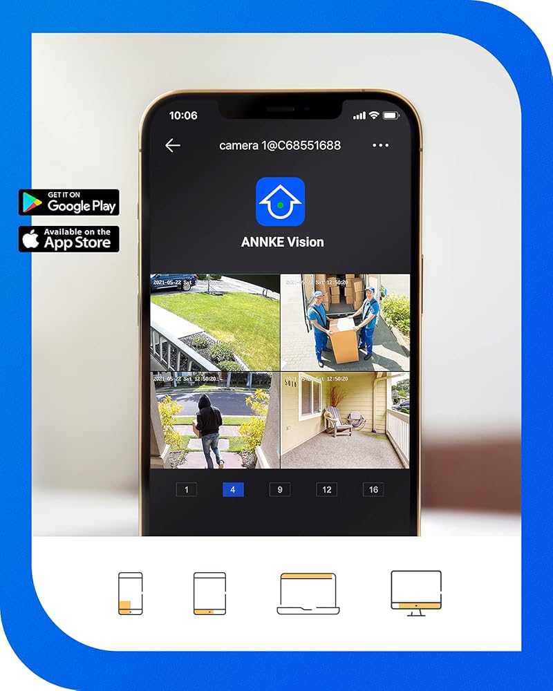 【الوصول عن بعد بين يديك】يمكنك الوصول إلى كاميرا IP الأمنية بشكل غير محدود عبر الهواتف وأجهزة الكمبيوتر والأجهزة اللوحية الخاصة بك للتحقق من منزلك أو مكتبك أينما كنت. قم بتخصيص مناطق الكشف التي تهمك أكثر للحصول على دفعات أو تنبيهات دقيقة للتطبيقات عند اكتشاف الحركات في المناطق المحددة.