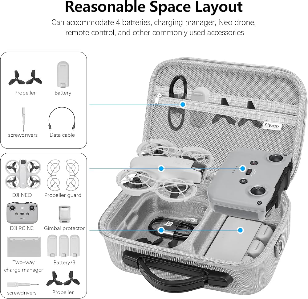【تصميم معقول】تم تصميم كل مساحة لملحقات dji neo، ويمكنها تخزين طائرة dji neo بدون طيار، ووحدة التحكم الذكية dji rc-n3، وبطارية الطيران الذكية، والكابلات، وعصي التحكم الاحتياطية وغيرها من الملحقات