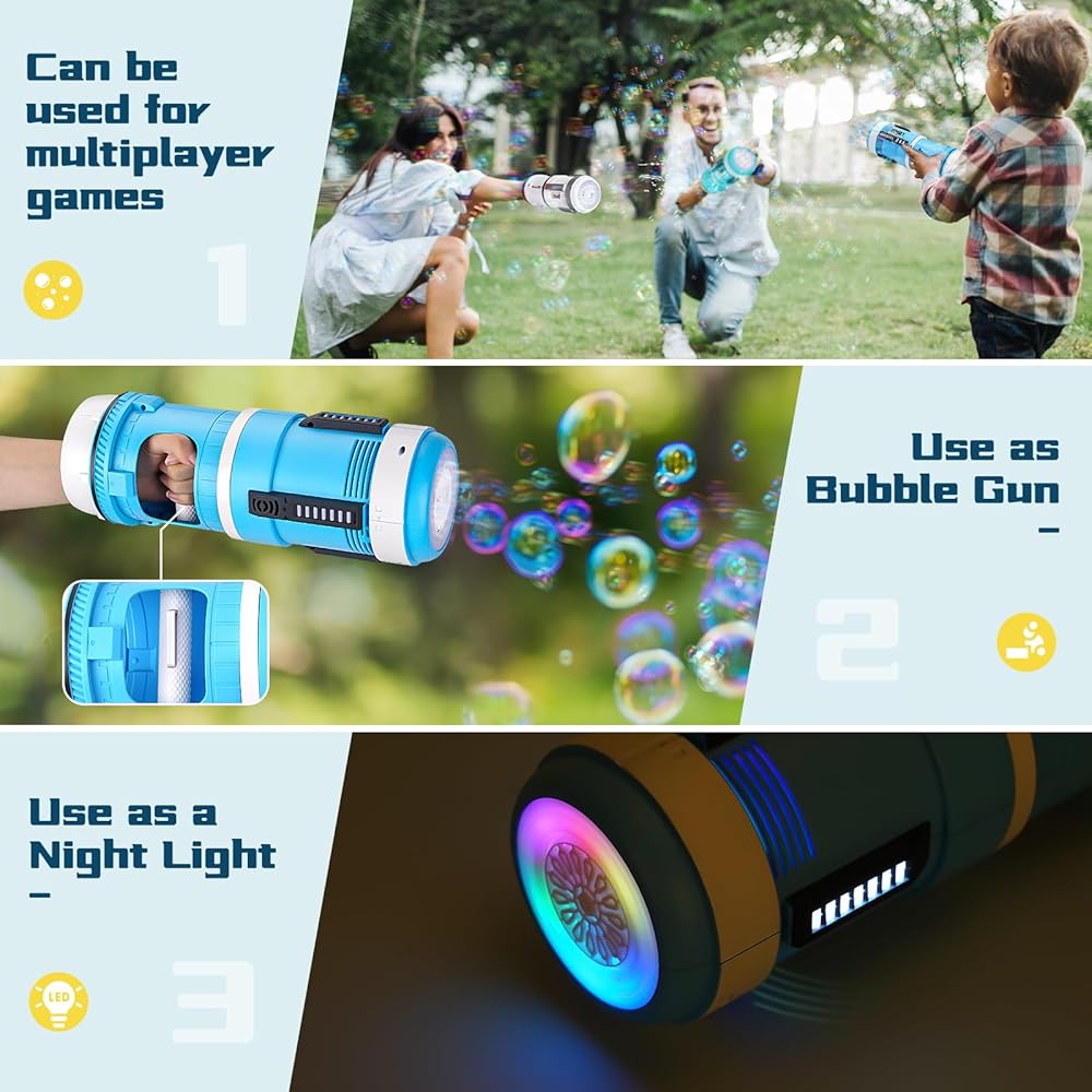 【 مسدس فقاعات مع أضواء】🏝️توجد أضواء LED ملونة مع لعبة الفقاعات هذه، لا يمكنك فقط استخدام آلة الفقاعات هذه في ضوء النهار فحسب، بل يمكنك أيضًا الاستمتاع بالكثير من المرح مع الفقاعات الملونة الحالمة في الليل وتمنحك شعورًا رائعًا مختلفًا. .
