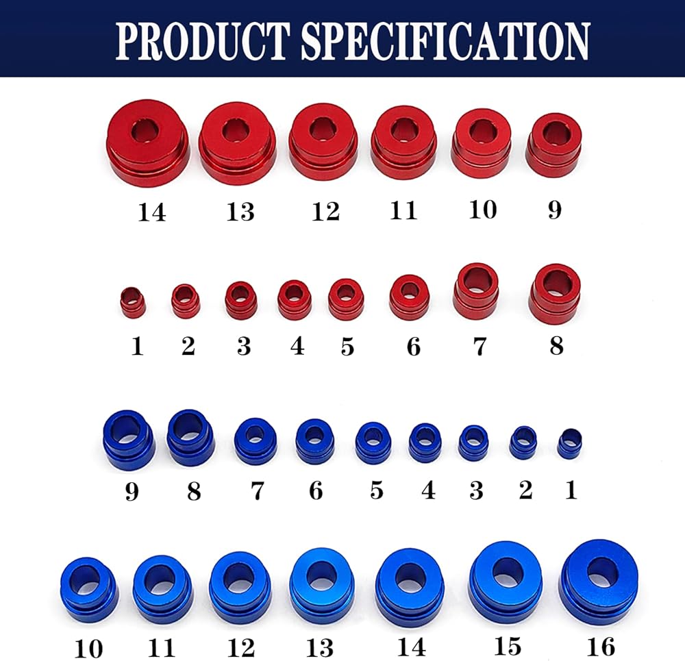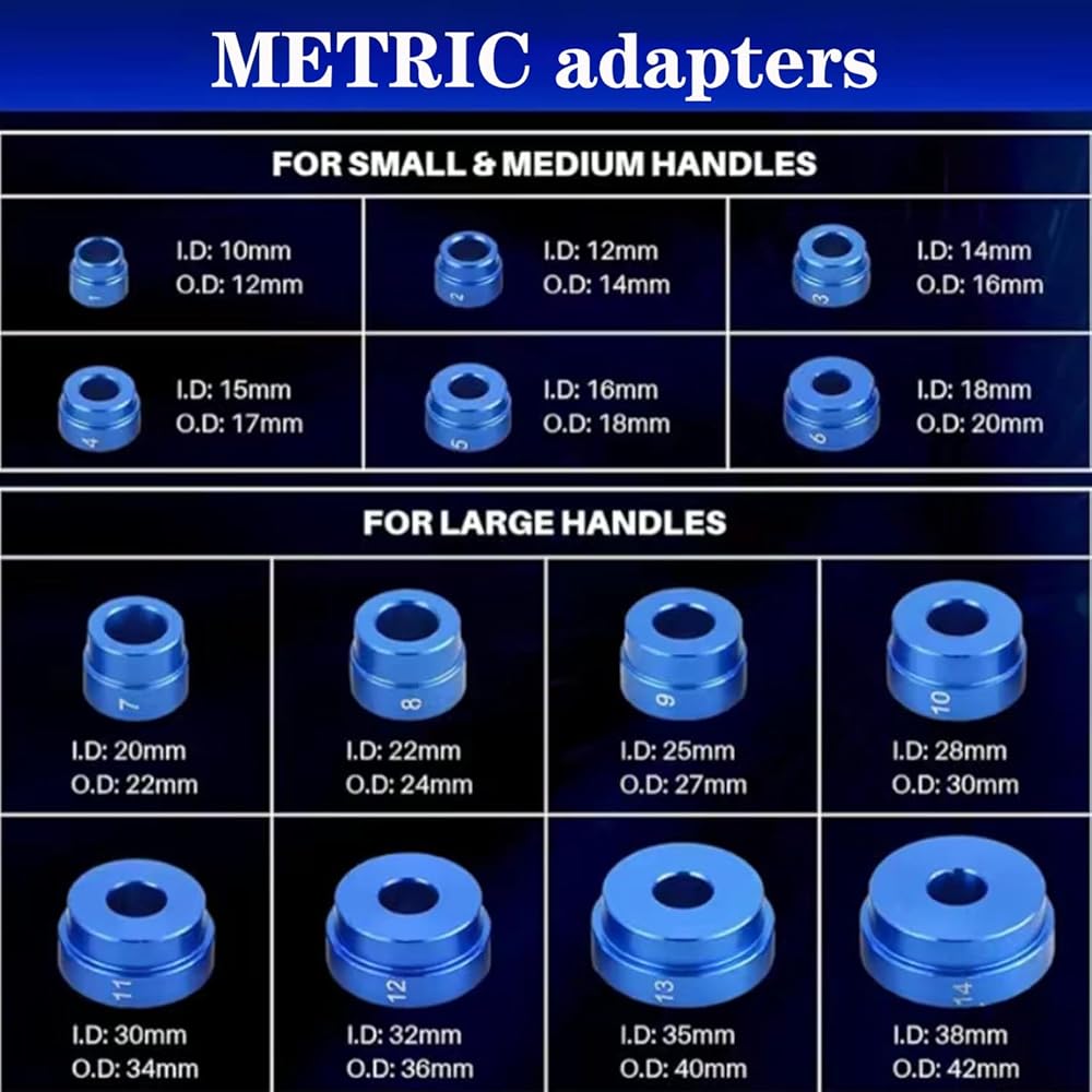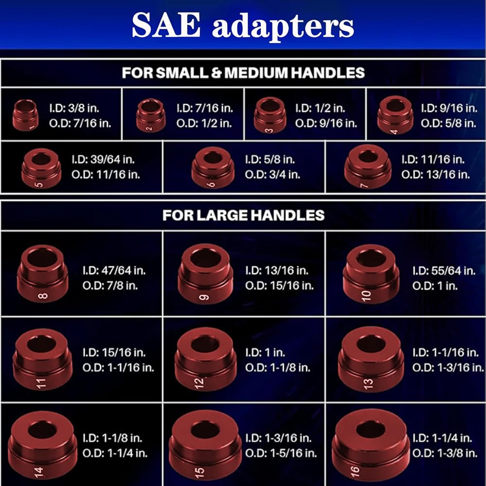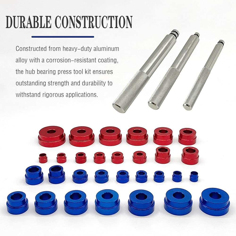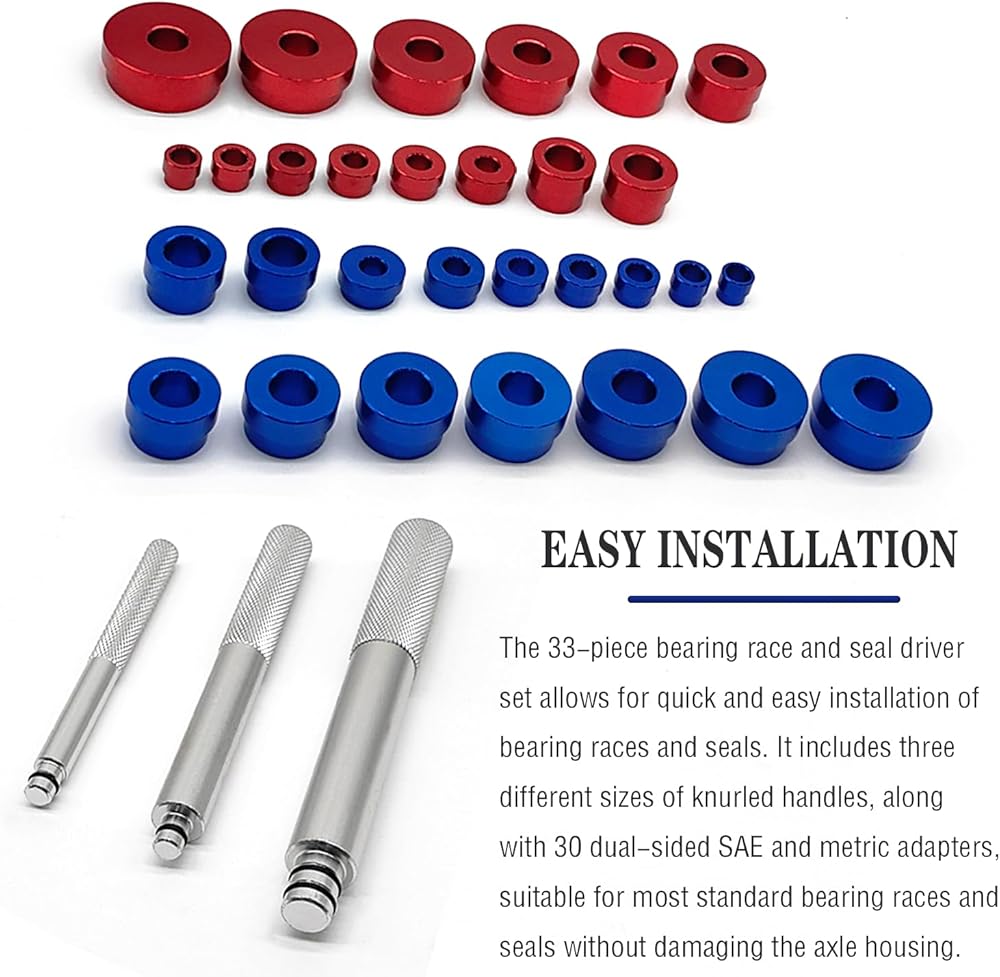 The 33-piece bearing race and seal driver set allows for quick and easy installation of bearing races and seals. It includes three different sizes of knurled handles, along with 30 dual-sided SAE and metric adapters, suitable for most standard bearing races and seals without damaging the axle housing.