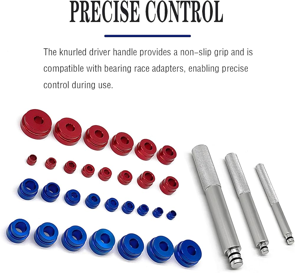 The knurled driver handle provides a non-slip grip and is compatible with bearing race adapters, enabling precise control during use.