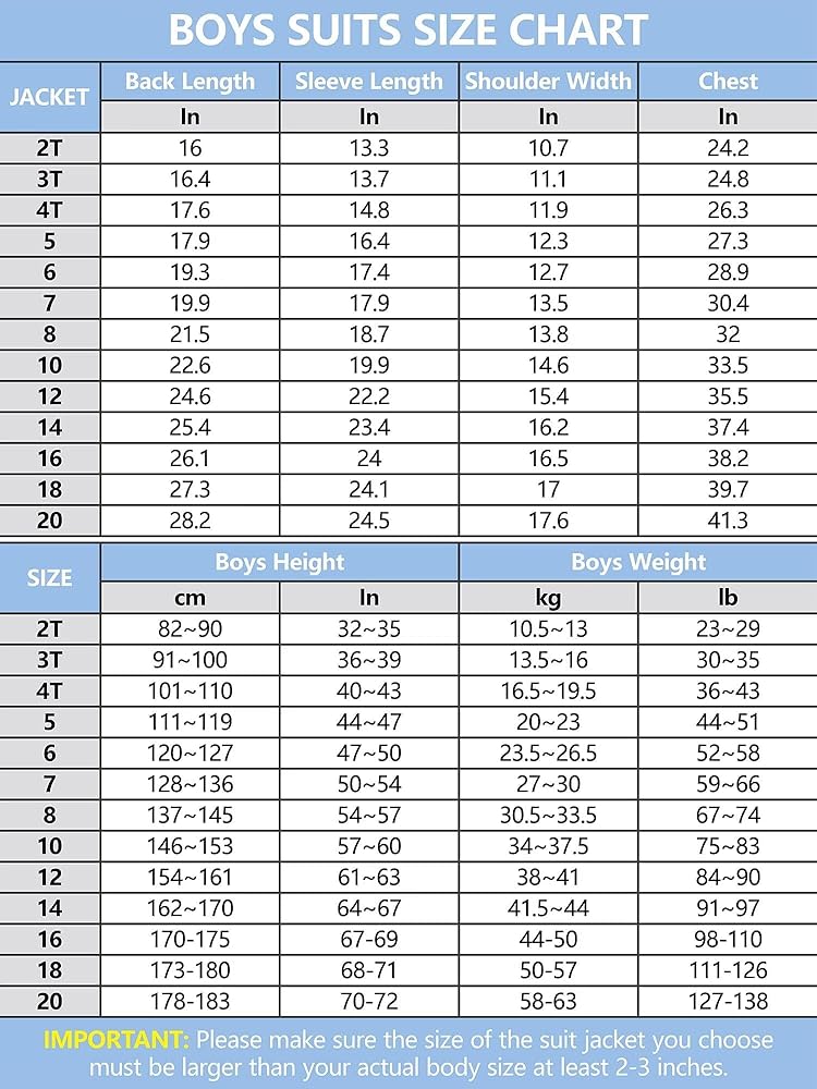المقاس: يرجى الرجوع إلى جدول مقاسات الصورة الخاص بنا للحصول على أفضل ملاءمة. مقاس بدلة الأطفال الصغار: 2t، 3t، 4t، 5,6؛ مقاس بدلة الأولاد: 7,8,10,12,14,16؛ مقاس بدلة المراهقين 18-20.