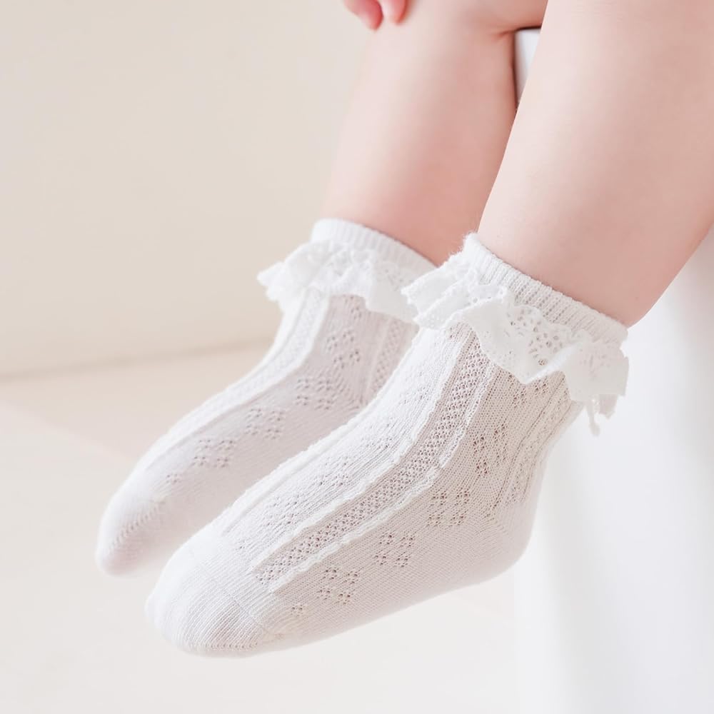 جوارب للأطفال ذات حافة من الدانتيل، ستبدو الجوارب رائعة مع زوج من ماري جين وفستان؛ مسامية وخفيفة، وتتوافق بشكل مثالي مع العديد من فساتين الفتيات الزهور والمهرجانات وغيرها من فساتين المناسبات الخاصة