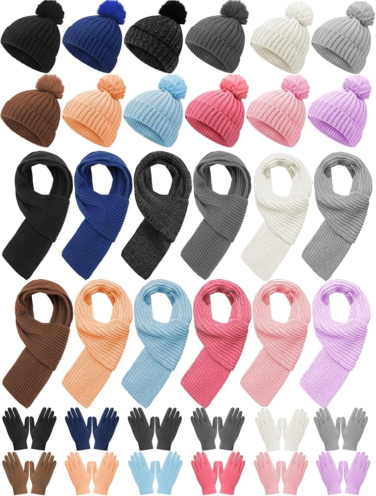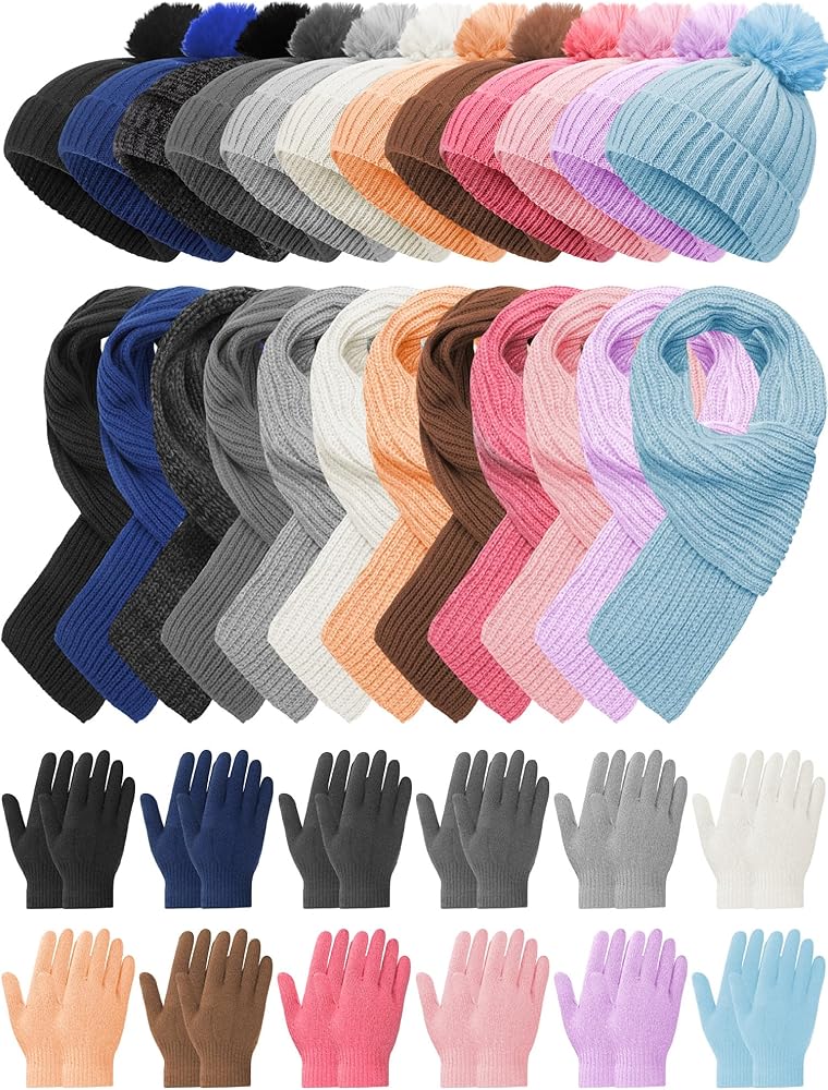 مجموعة من 12 مجموعة لدفء الشتاء للأطفال: سوف تحصل على 12 قطعة من قبعات الشتاء للأطفال و12 زوجًا من القفازات المنسوجة، و12 وشاحًا للأطفال، و36 قطعة إجمالاً، مع 12 لونًا مختلفًا، الألوان متنوعة وكافية للاستخدام اليومي استبدال؛ يمكن أن توفر مجموعات قفازات وشاح القبعة الدافئة واللطيفة للأطفال حماية باردة للأطفال في الطقس البارد، وهي عناصر مثالية للأطفال للتدفئة في الشتاء.