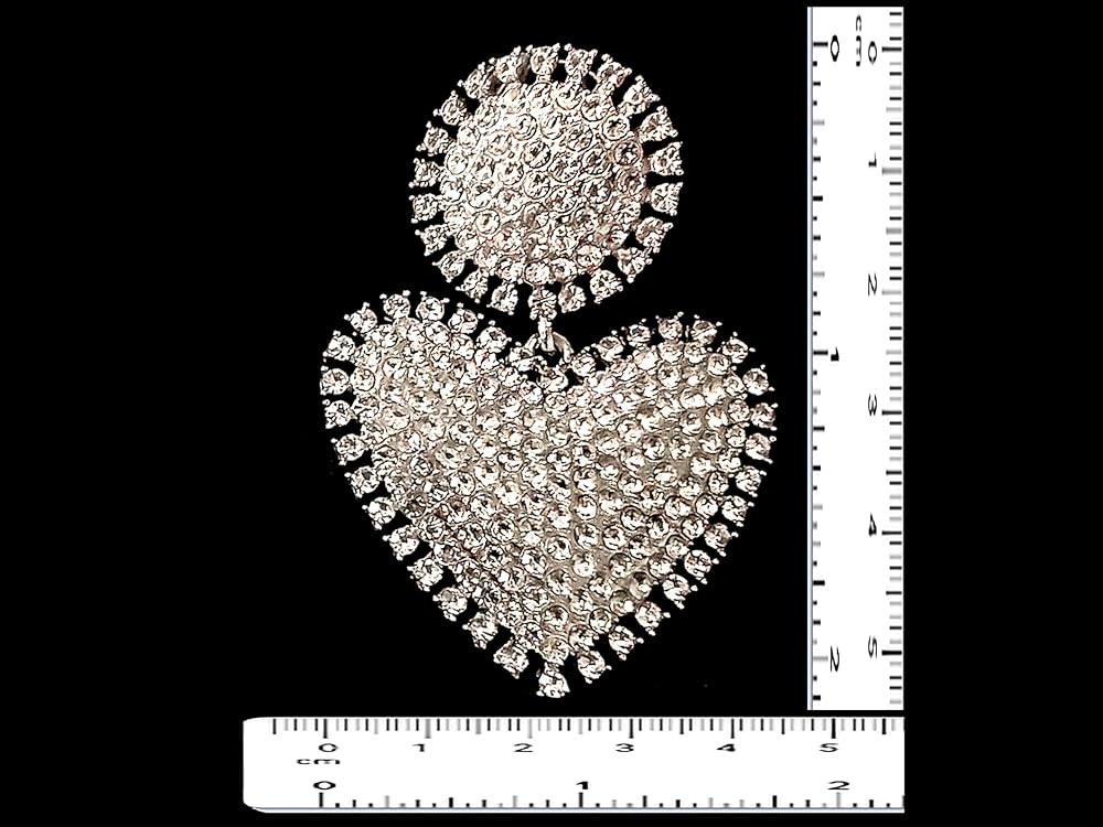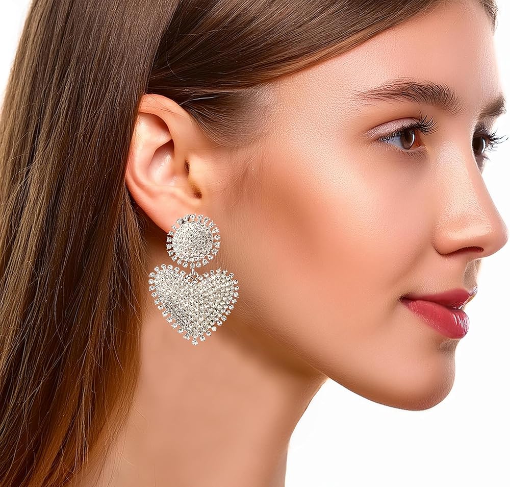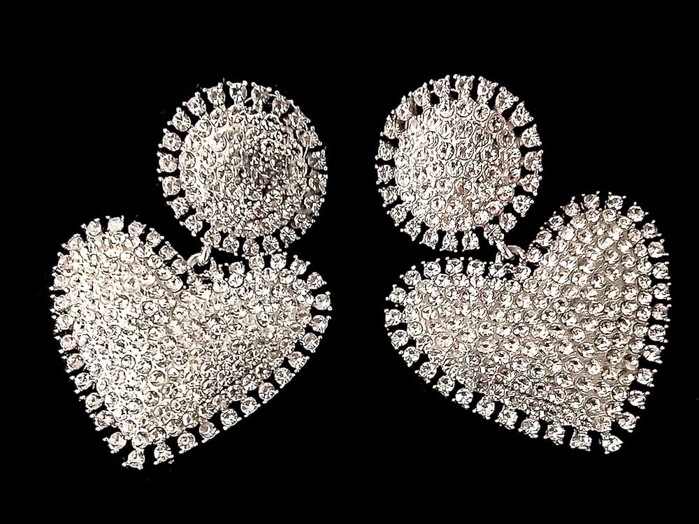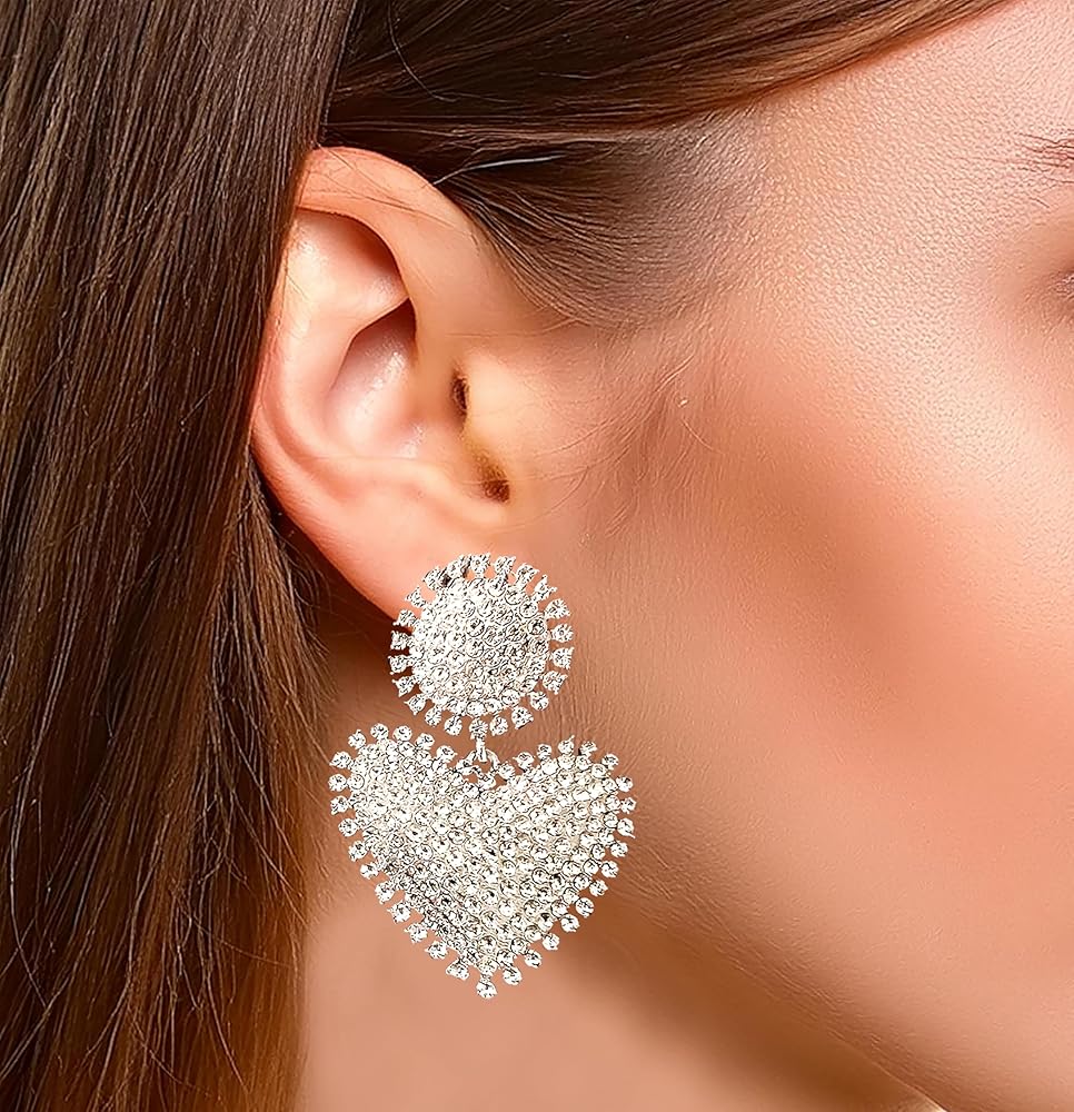 Elevate your style with these dazzling fashion heart earrings for pierced ears. Crafted with meticulous attention to detail, each earring is adorned with a captivating cluster of sparkling crystals that catch the light from every angle. The intricate arrangement of these radiant gems forms a striking heart shape, adding a touch of romance and elegance to any ensemble. Whether you're dressing up for a special occasion or simply want to add a touch of glamour to your everyday look, these earrings are sure to turn heads. These dangle, drop earrings are lightweight and comfortable to wear all day. They make a perfect accessory for any fashionista. Embrace your inner diva and let these heart shaped earrings for women be the showstopping centerpiece of your look. At two inches in length, these heart-shaped earrings are bold enough to make a dramatic statement of eye-catching style that will make you stand out from the crowd. These drop,, dangle, lightweight earrings will add some flashy bling to your wardrobe. The crystals catch the light to sparkle and glimmer with every turn of the head for maximum bling factor. These cute earrings make a great gift for birthdays, Valentine's Day, or Christmas.