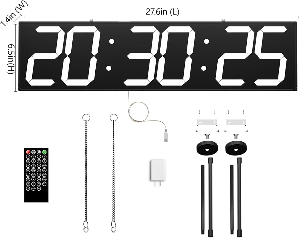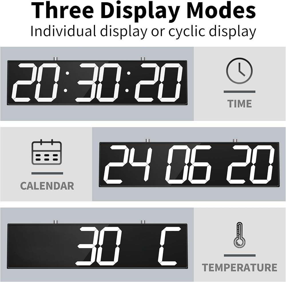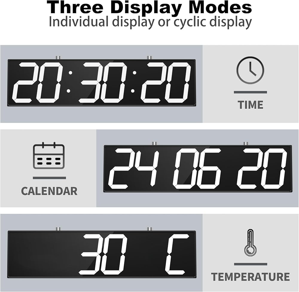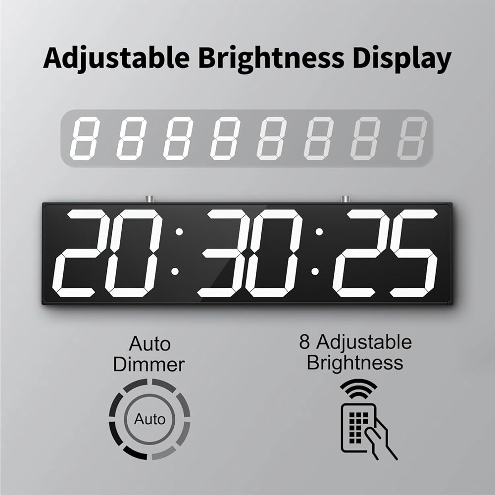 سطوع قابل للتعديل: أرقام LED لافتة للنظر في ساعة الحائط الرقمية الكبيرة قابلة للتعديل في السطوع ويمكن تخصيصها لظروف الإضاءة المختلفة. هناك 8 مستويات سطوع ثابتة يمكن ضبطها، أو يمكنك اختيار وضع الاستشعار التلقائي للسماح للساعة بضبط السطوع تلقائيًا بناءً على التغيرات البيئية.