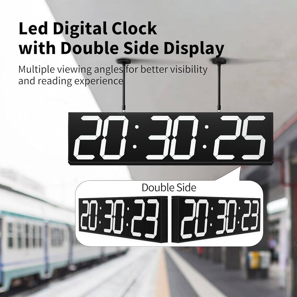 شاشة مزدوجة الجانب: تتميز هذه الساعة الرقمية LED الموسعة بتصميم مزدوج الجانب مع ما يصل إلى 428 مصباح LED، يمكن رؤيتها حتى في الضوء المحيط الساطع أو من مسافة بعيدة. يعمل تصميمه ثنائي الجوانب على زيادة الفائدة إلى أقصى حد من خلال السماح بقراءة الوقت من كلا الجانبين، مما يلبي زوايا مشاهدة متنوعة في أي بيئة.