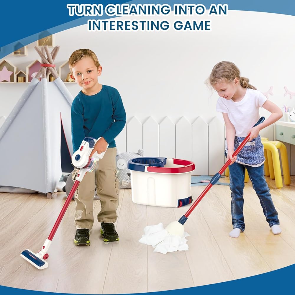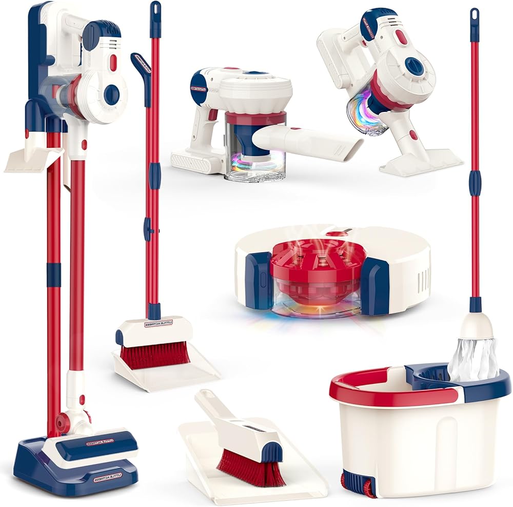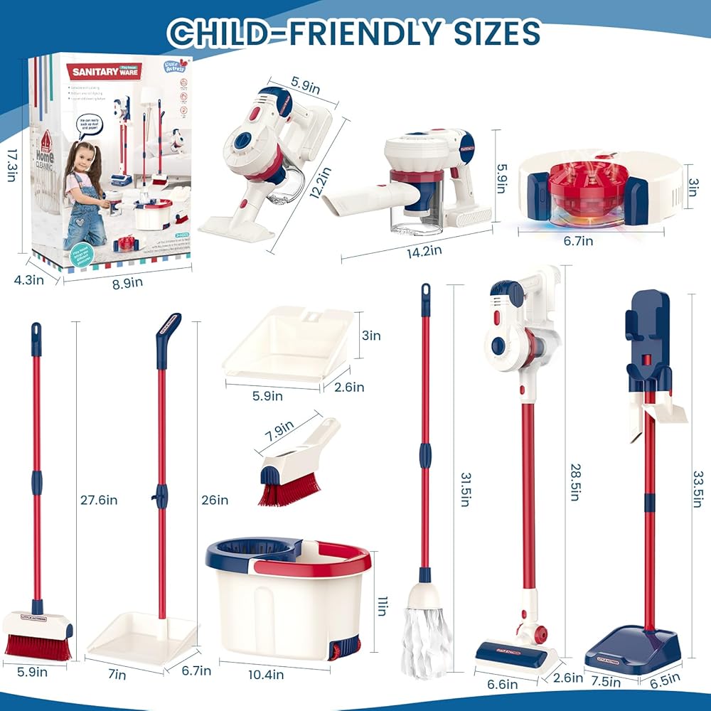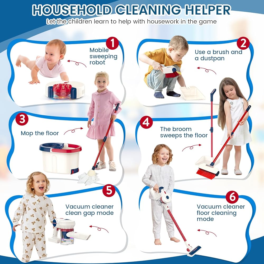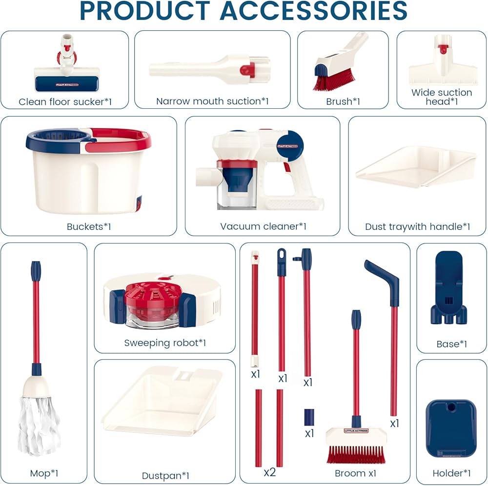 【سهلة التجميع】: مصممة بنظام إطلاق وإزالة صديق للأطفال، تسمح مكنسة الألعاب هذه للأطفال باستبدال الملحقات بسهولة. رف تخزين الشفط لا يأخذ مساحة، ويعزز الوعي بالتخزين والتنظيم