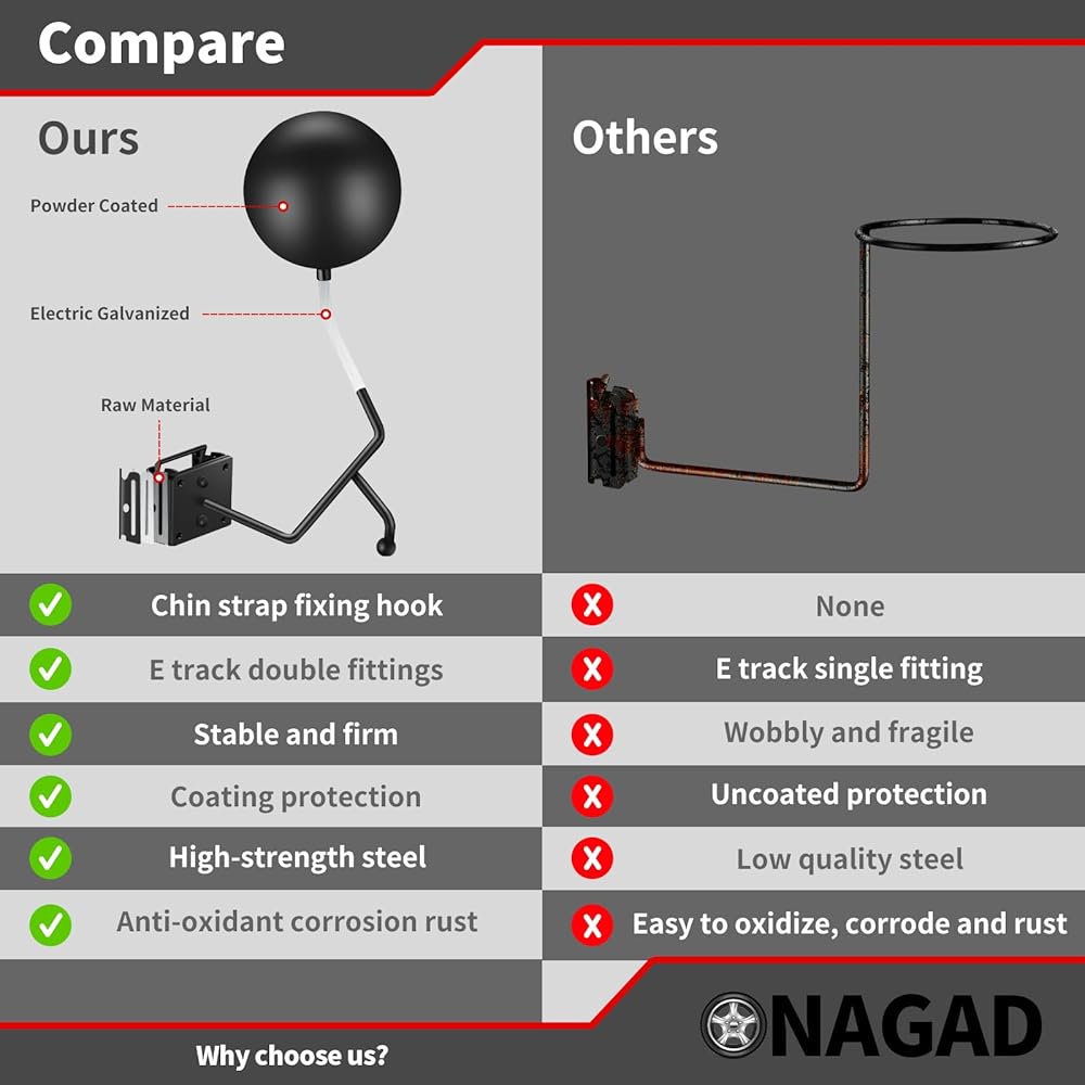 تصميم مطور: العلامات التجارية الأخرى لخوذة الدراجات النارية التي يتم تركيبها على الحائط في السوق لا يمكنها تأمين الخوذة - غير آمنة - ليست تركيبًا جيدًا، حامل الخوذة المطور الخاص بنا بتصميم حاصل على براءة اختراع لخطاف تثبيت حزام الذقن الفريد، وشد حزام ذقن الخوذة حول التثبيت خطاف لمنعها من الحركة ولن تسقط الخوذة بسبب اللمس العرضي أو حركة السيارة. لذلك يمكنك استخدامه ليس فقط في المرآب أو المستودع أو المبنى الثابت، ولكن أيضًا في الشاحنة والمقطورة المغلقة والشاحنة والعربة الترفيهية.