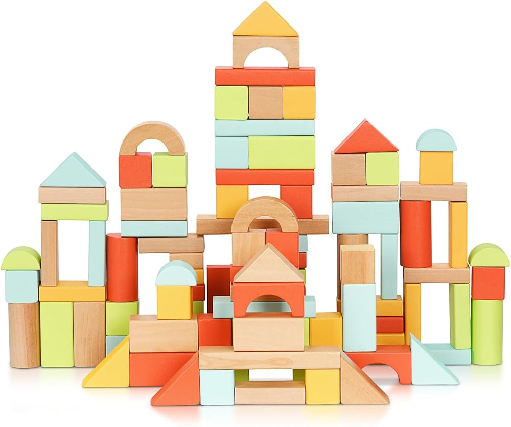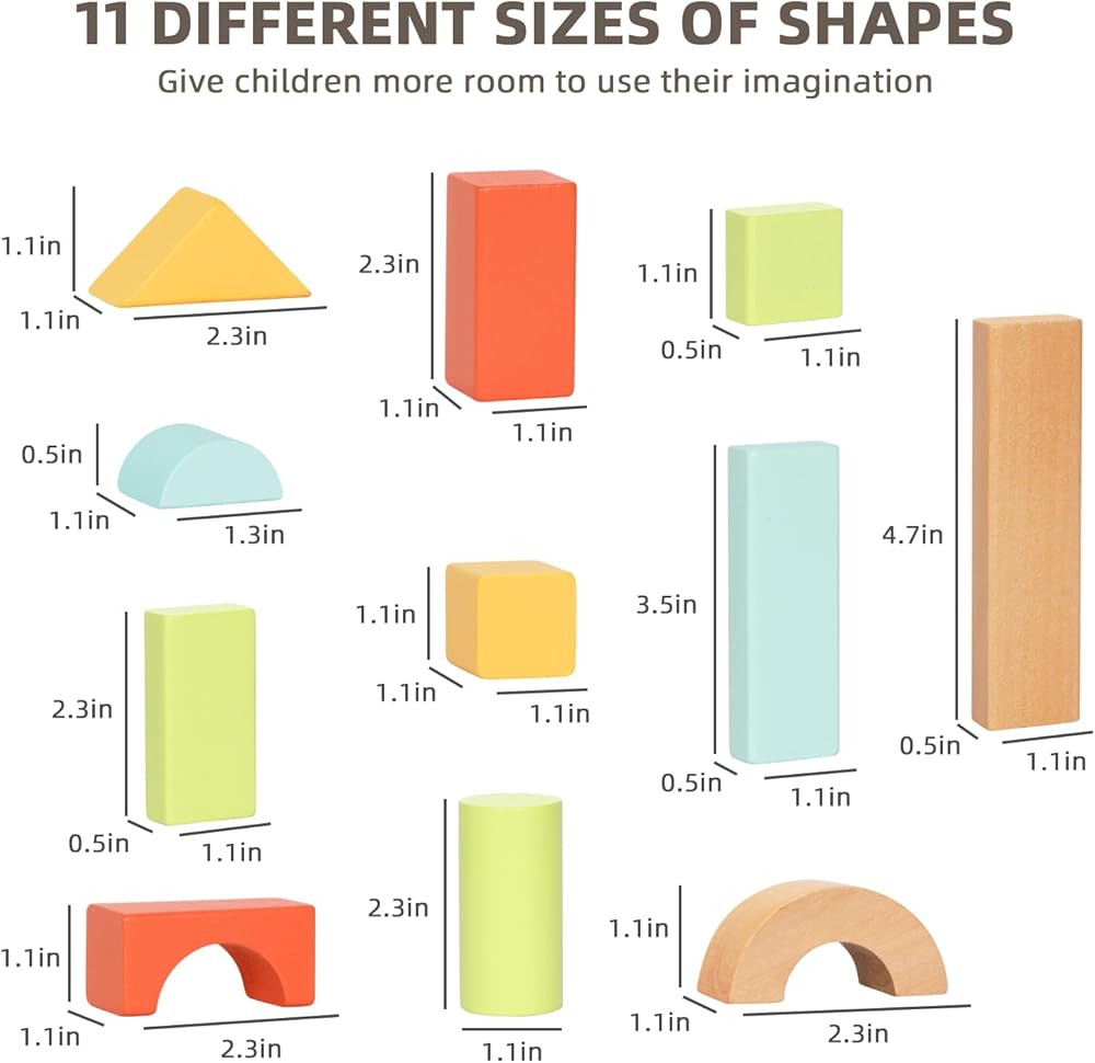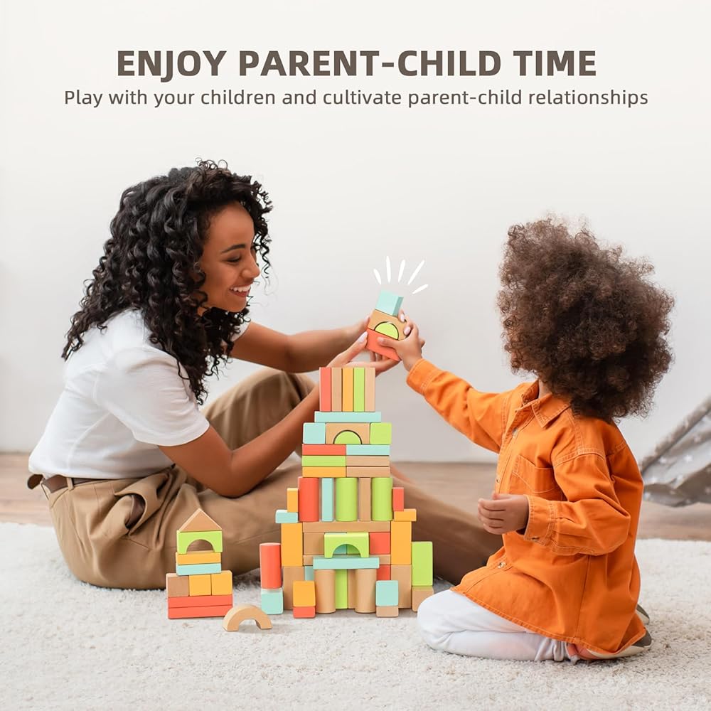 Safe for Toddlers - The building blocks for toddlers 3-5 are made of solid wood with water-based paint, colorful and BPA free, safe and non-toxic. Each block comes with rounded edges and smooth surfaces. Larger block sizes keep kids safe from choking hazards.