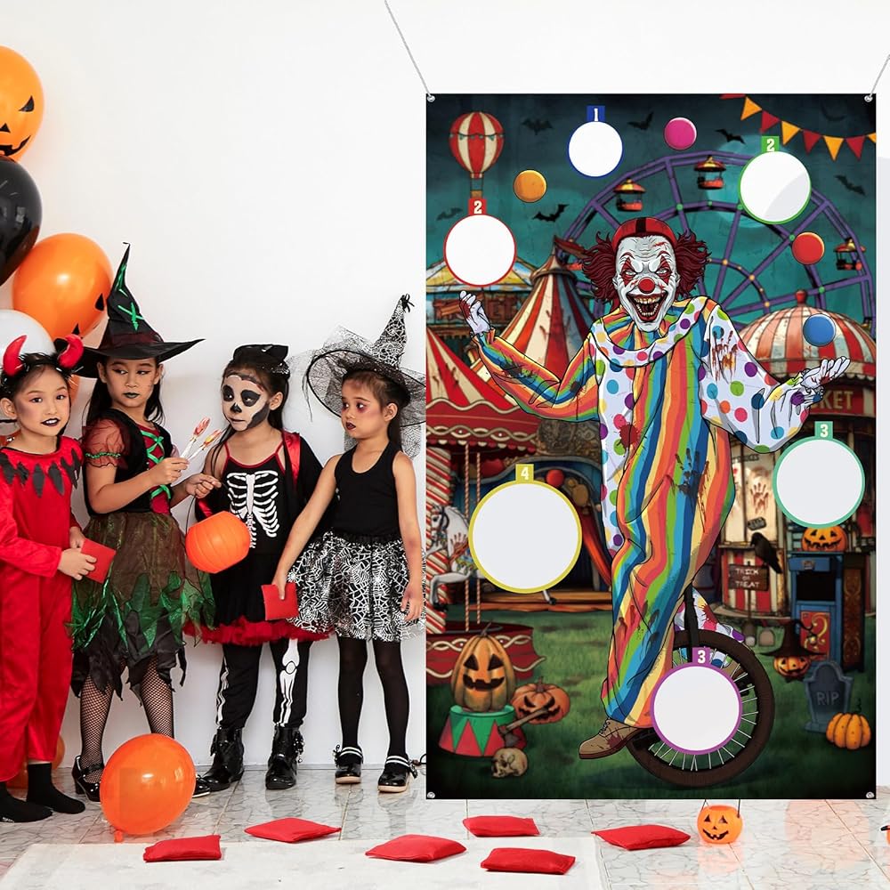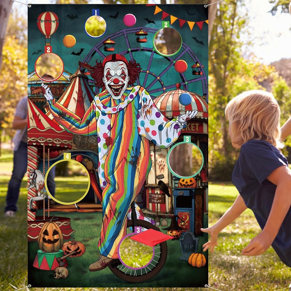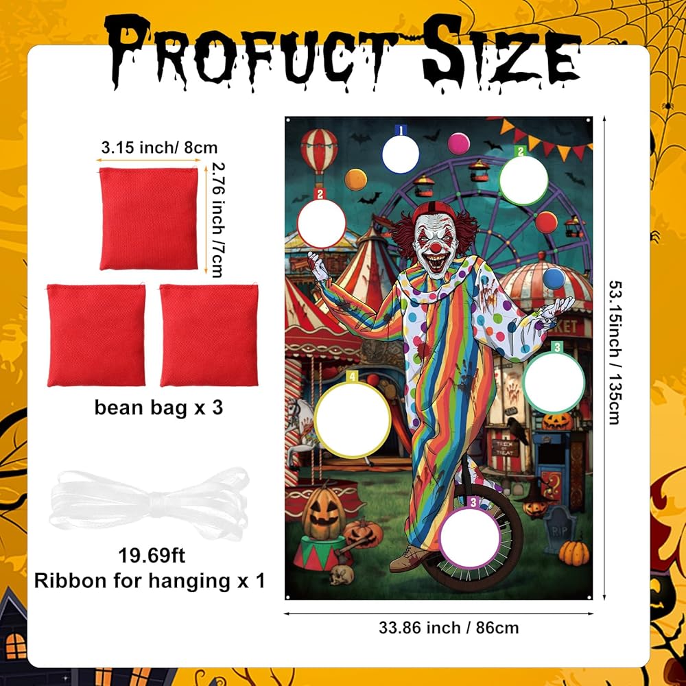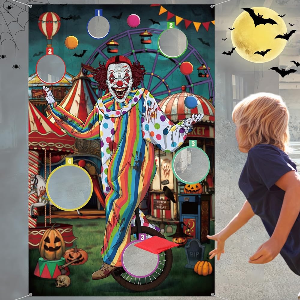 تصميم كلاسيكي للهالوين: تم تصميم لافتة لعبة الرمي للهالوين بمهرج مخيف ونمط سيرك وبعض عناصر الهالوين، لتبدو مميزة ومروعة، فهي ليس لها تأثير زخرفي مخيف فحسب، ولكنها أيضًا مثيرة جدًا للاهتمام.