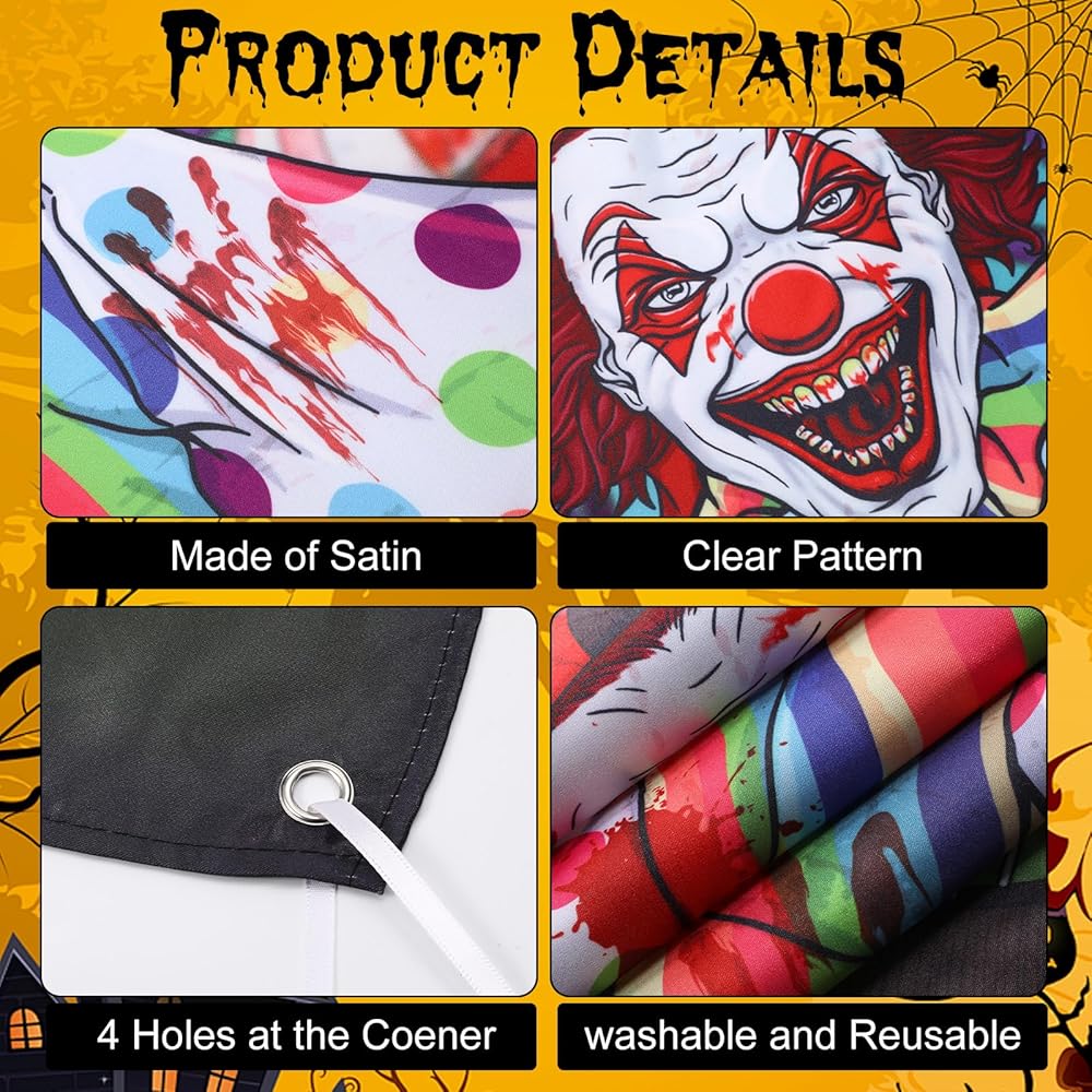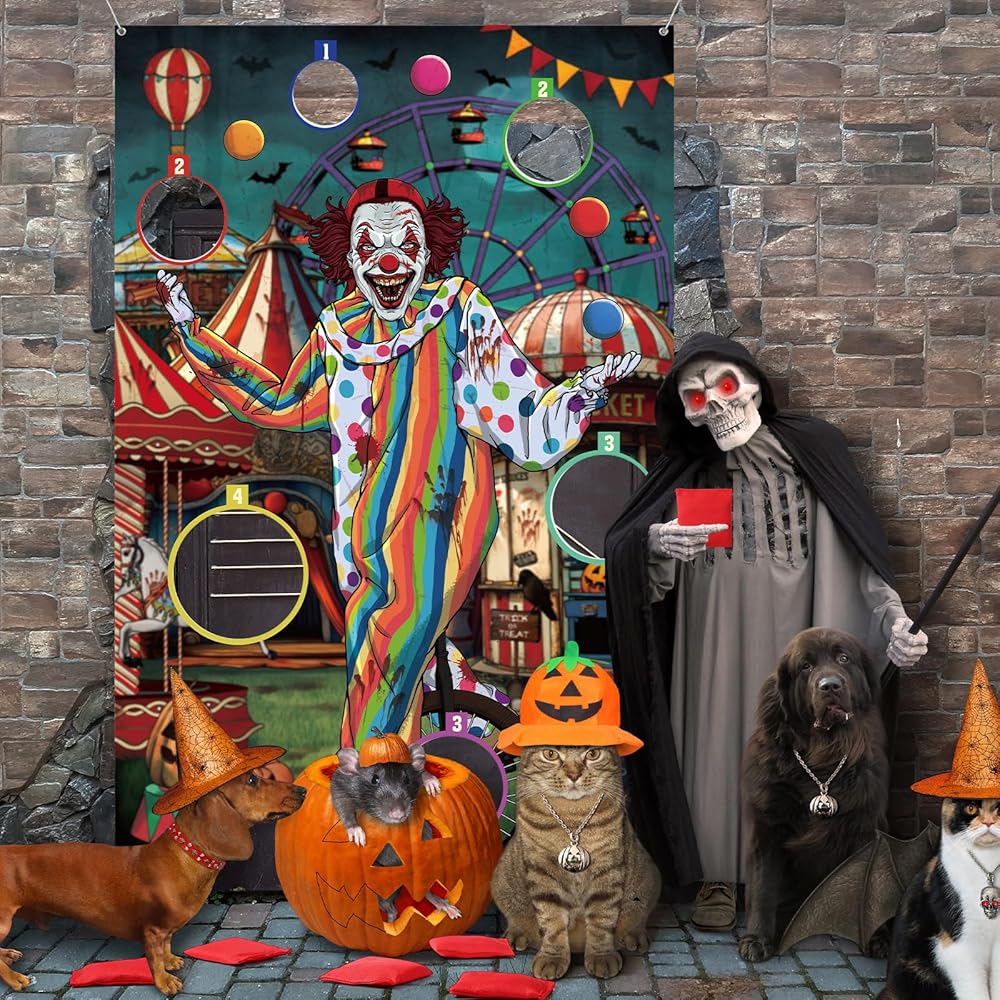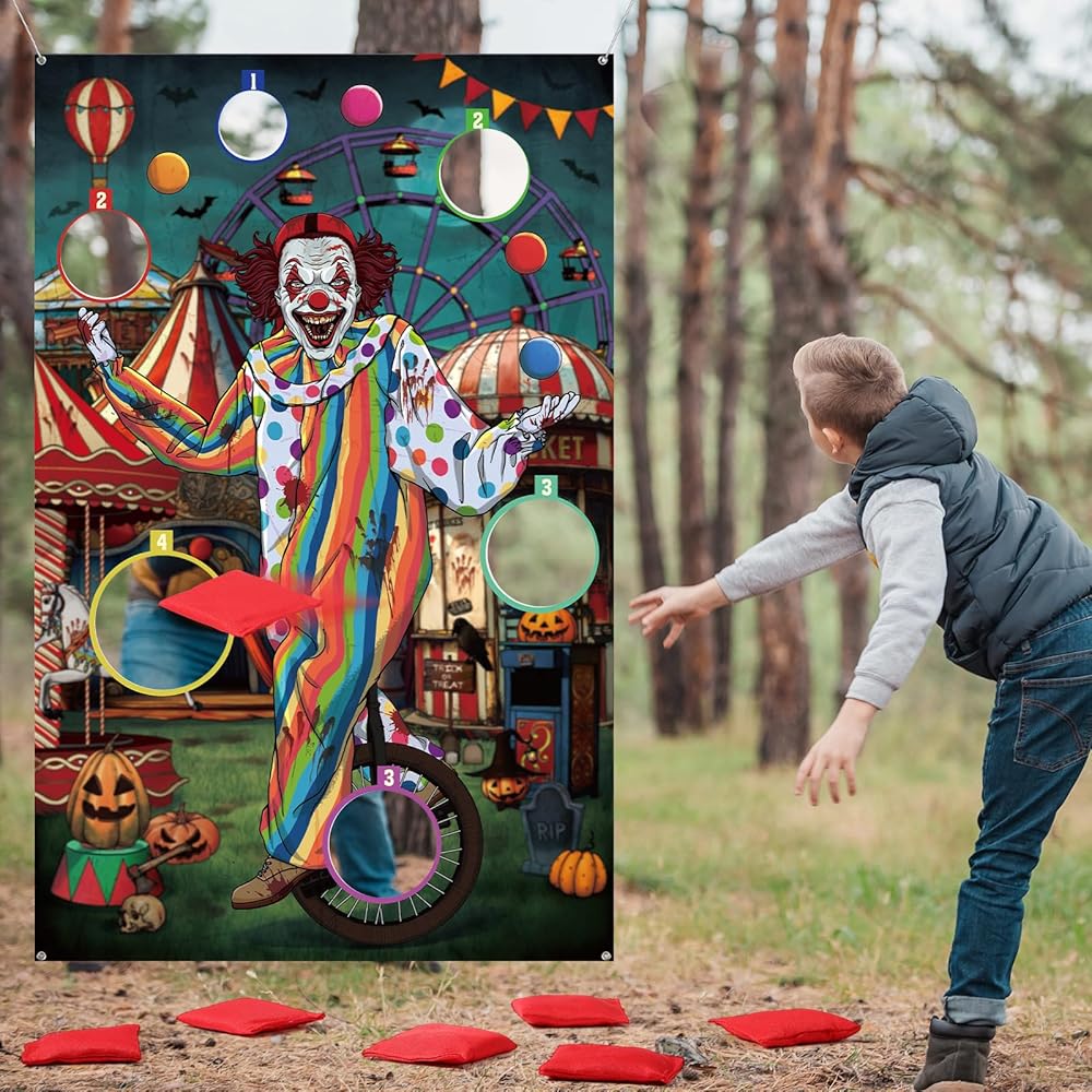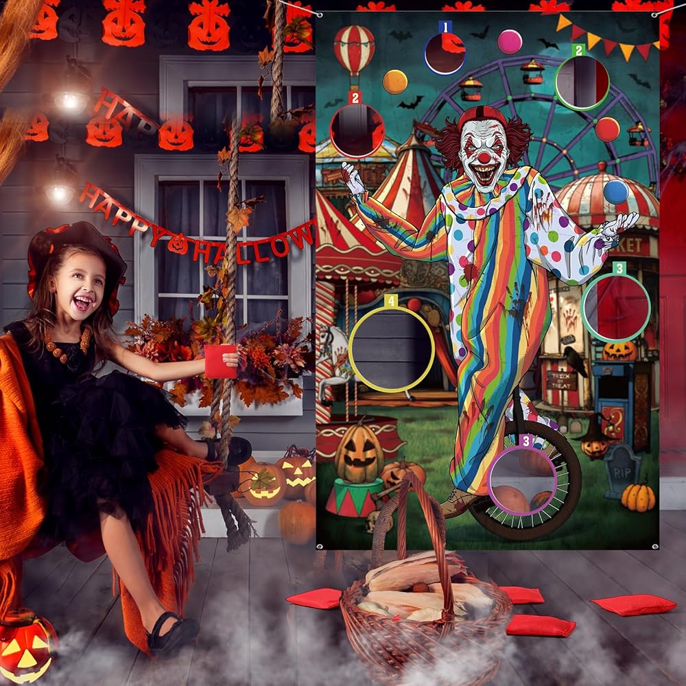 تصميم كلاسيكي للهالوين: تم تصميم لافتة لعبة الرمي للهالوين بمهرج مخيف ونمط سيرك وبعض عناصر الهالوين، لتبدو مميزة ومروعة، فهي ليس لها تأثير زخرفي مخيف فحسب، ولكنها أيضًا مثيرة جدًا للاهتمام.