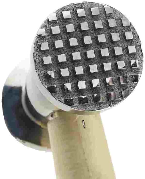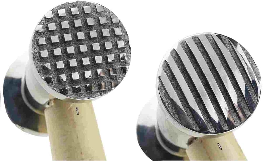يتميز أحد جانبي رأس المطرقة بنمط رقعة الشطرنج، بينما يتميز الجانب الآخر بخطوط عريضة، مما يسمح بتأثيرات تركيبية متنوعة.