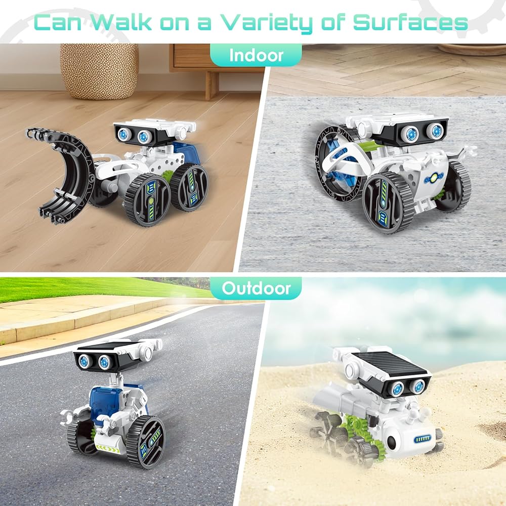 مجموعة الروبوت الشمسي 12 في 1: يمكن بناء مجموعة الروبوت الشمسي هذه في 12 شكلاً مختلفًا من الروبوتات بتصميم أنيق جديد. تتكون من 208 قطعة، بما في ذلك الأجزاء المتحركة والربط مثل التروس والألواح والإطارات والأعمدة. يمكن للأطفال تفكيكها بسهولة بعد بناء كل روبوت