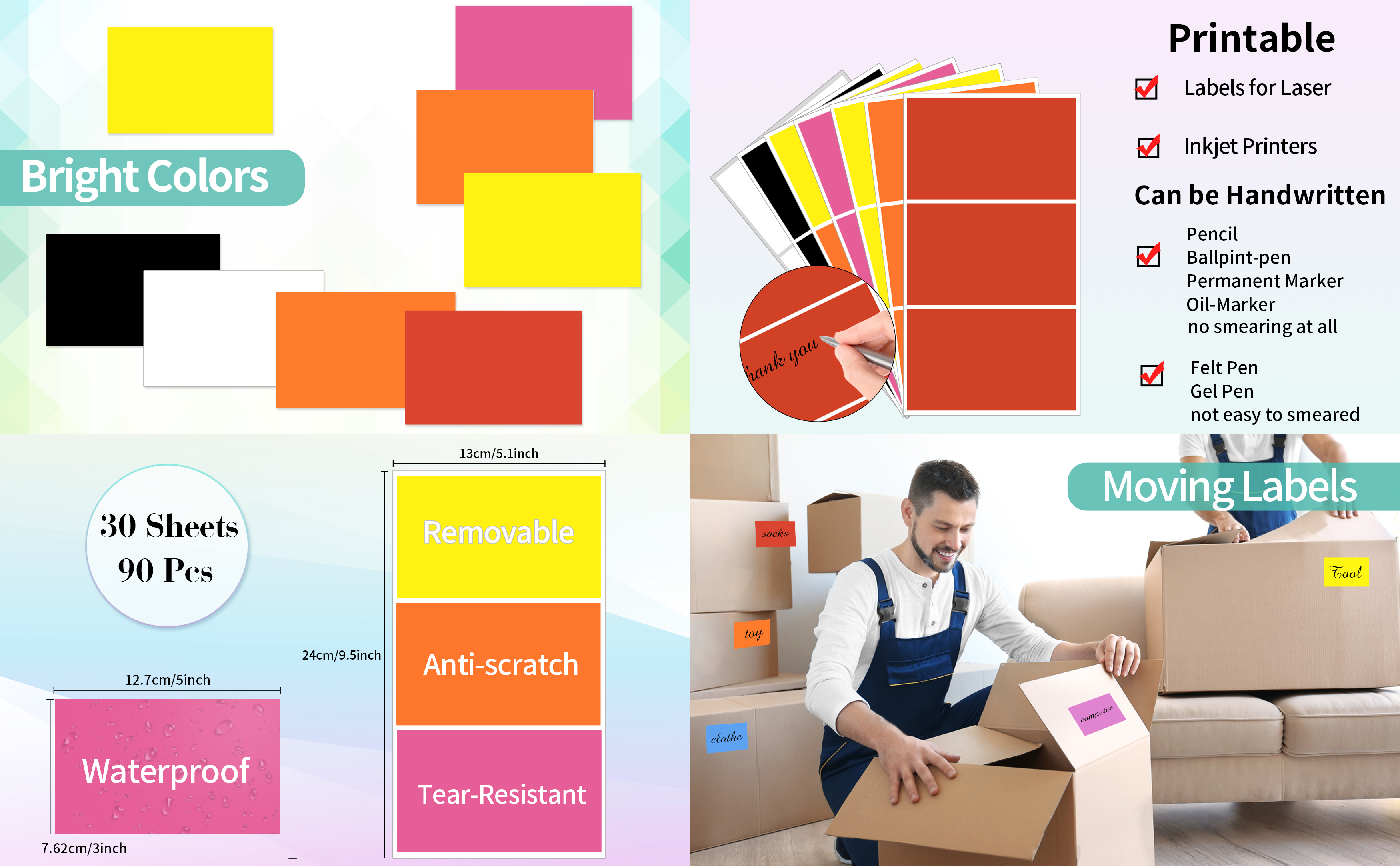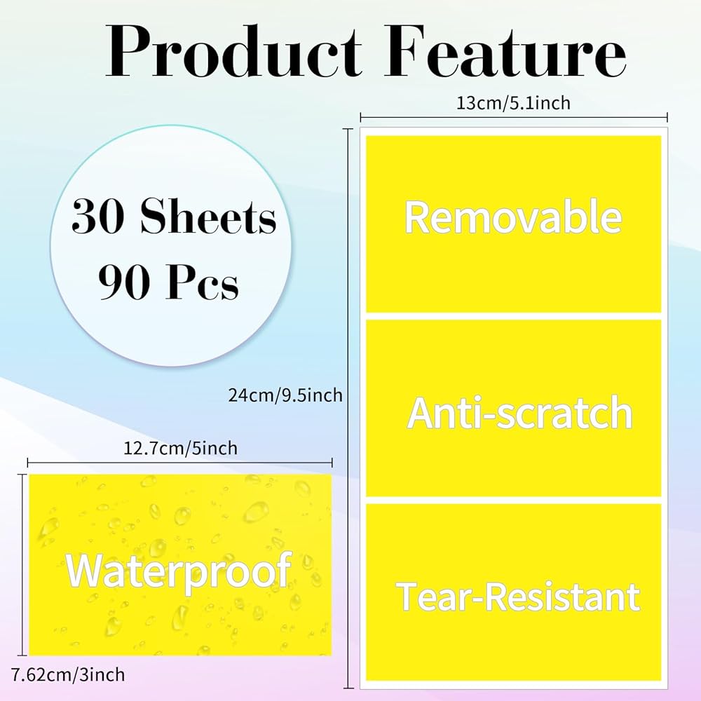 العبوة: سوف تحصل على 90 ملصق ملون كبير مستطيل قابل للإزالة، كل ملصق مربع بمقاس 3 بوصة × 5 بوصة، كمية كافية لتلبية الاحتياجات اليومية ومثالية للأعمال الصغيرة أو الاستخدام الشخصي