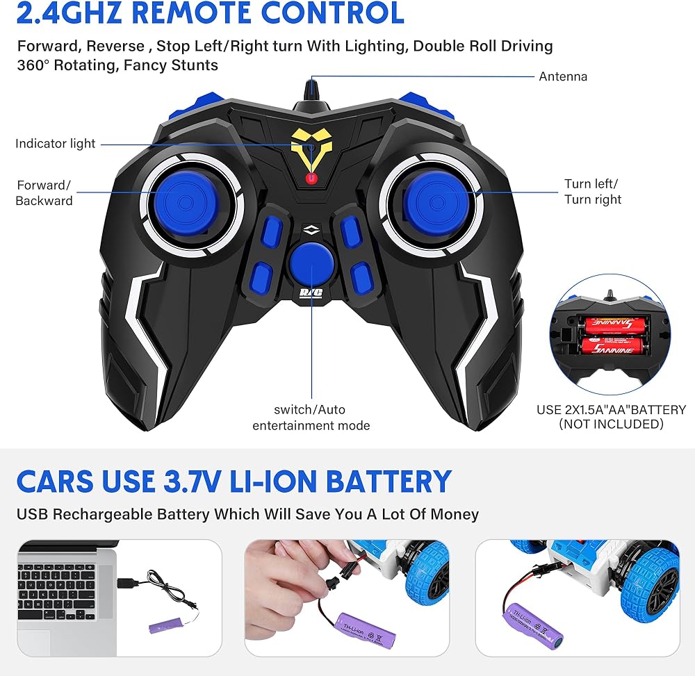 RC Stunt Car: 360-Degree rotation on dual-sides, race to drift and flip the RC car all around. This RC stunt car for kids will spin like a crazy cyclone with cool lighting effects. You can control the RC cars in any direction with its remote controller.