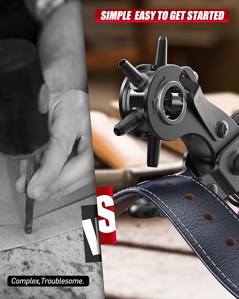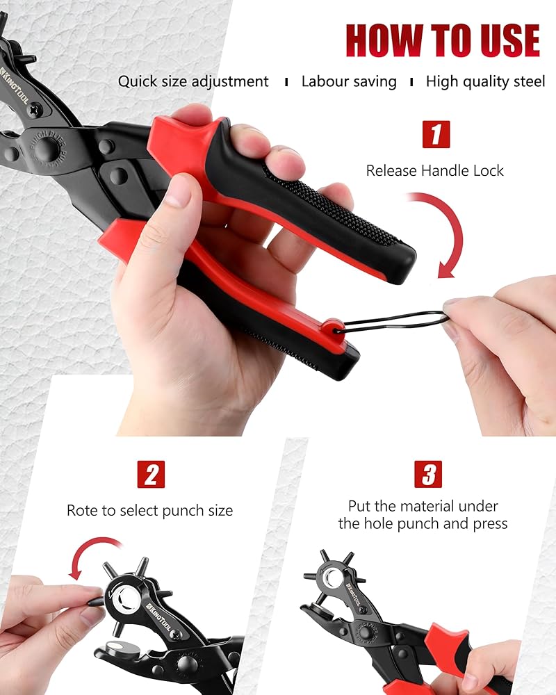 سهلة الاستخدام: مجموعة ثقب الجلد سهلة الاستخدام لفتحات الحزام التي تصنعها بنفسك، ما عليك سوى فتح المقبض، ثم قم بتدويرها لتحديد حجم الثقب المطلوب على القرص حتى تشعر بالنقر. أخيرًا، ما عليك سوى الضغط عليه لثقب الجلد في المكان المرغوب فيه.
