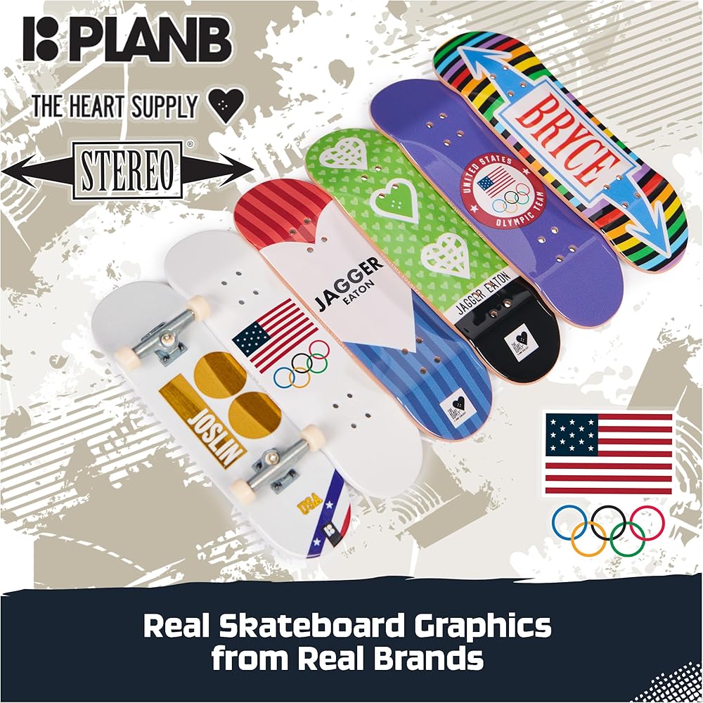 Tech Deck brings you the real deal with authentic fingerboards from real skate companies! The Team USA Sk8 6-Pack features graphics from Plan B, The Heart Supply, Stereo and 2 exclusive Team USA Boards. Collect boards from your favorite Team USA riders like Jagger Eaton, Chris Joslin and Bryce Weinstein. This 6-Pack includes an assembled board and 5 decks you can build any way you want. Recreate your favorite lines and expand your trick difficulty just like what the pros do. Ride and grind your new finger skateboards for kids on the Team USA Olympic X-Connect series. Build out the X-Connect series ramp sets (each sold separately) to create your own Tech Deck Olympic fingerboard skatepark at home. There are a ton of Decks, toy figures & playsets to collect! Ride, flip, and grind with Tech Deck fingerboards from real skate companies! Tech Deck mini skateboards for fingers and ramp sets make the perfect gift for girls toys age 6-8 who love small toys, mini brands and cool toys or as an alternative to toy cars as a boys toys age 6-8 item. Jump start your collection and master your fingerboard tricks just like the pros with Tech Deck!