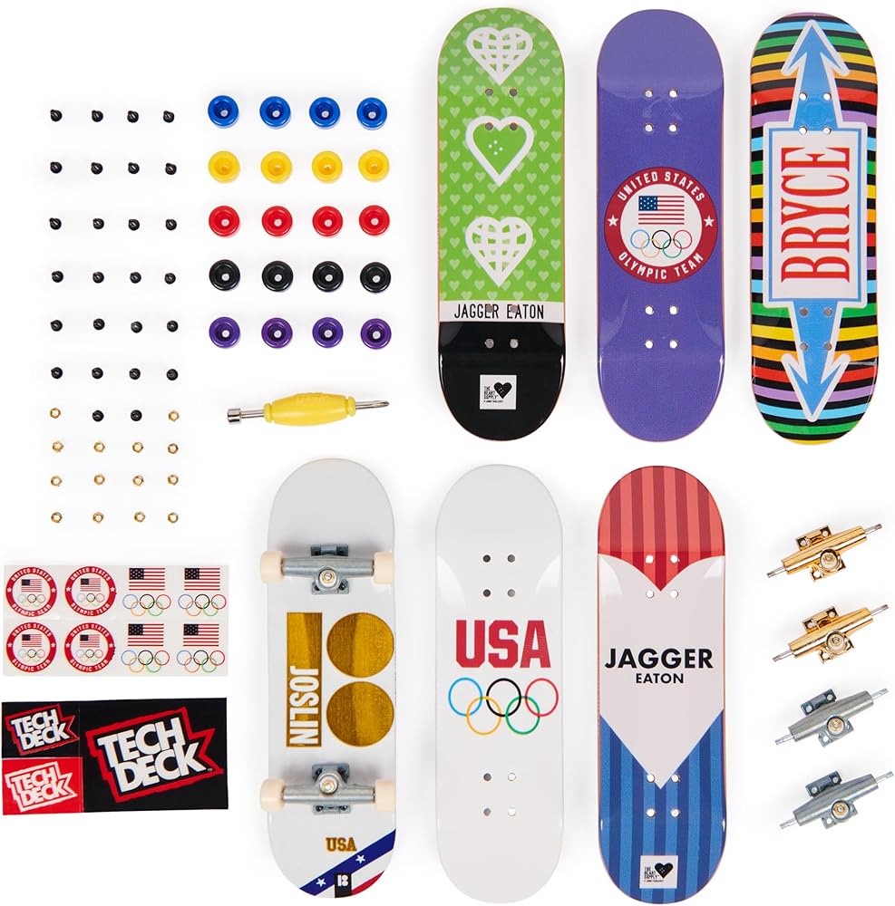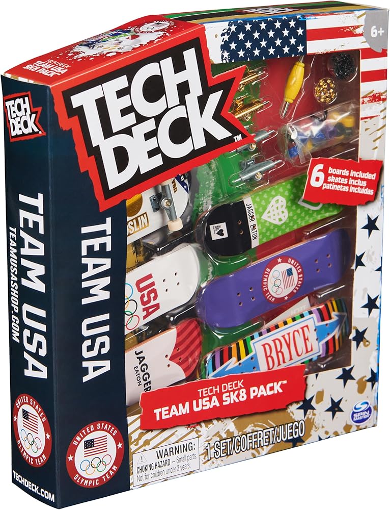 TECH DECK، مجموعة من 6 قطع من Team USA Sk8، ألواح تزلج صغيرة قابلة للجمع والتخصيص، ألعاب للأطفال للأعمار من 6 سنوات فما فوق، حصريًا من Amazon