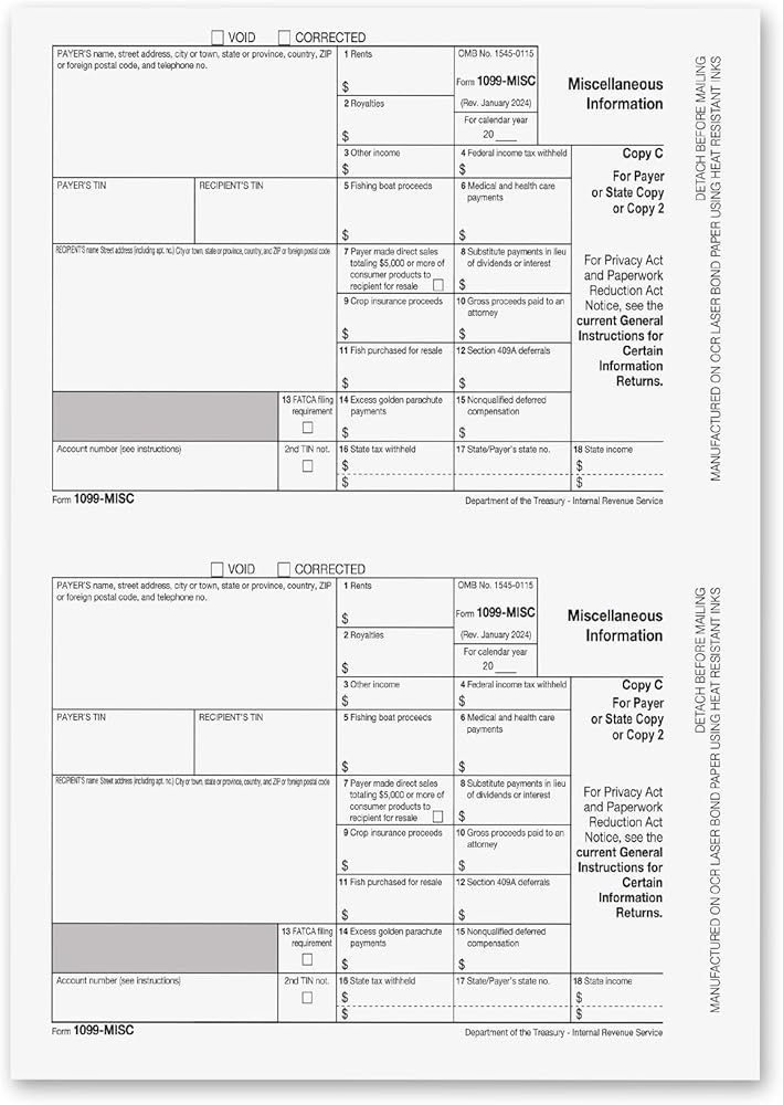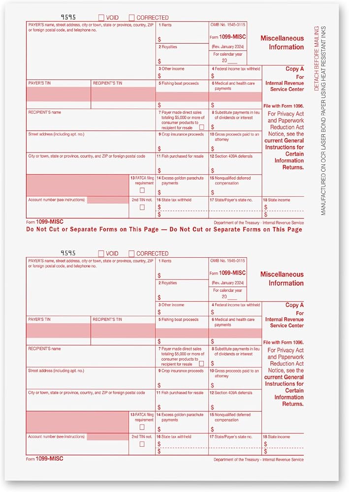 1099 نماذج MISC 2024، 1099 نماذج ليزر MISC معتمدة من IRS مصممة لبرامج الضرائب والمحاسبة 2024، مجموعة نماذج ضريبية مكونة من 4 أجزاء، 25 مظروفًا ذاتي الختم، 25 مجموعة بائع - إجمالي 54 (105) نموذجًا