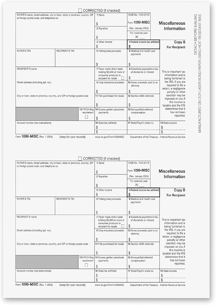 • مجموعة نماذج ضرائب الليزر المزدوجة - (حالة مكونة من 4 أجزاء) لعام 2024 لتلبية احتياجات 25 فردًا. لقد تم تصميمه بما يتوافق مع المتطلبات الحكومية وهو صالح ومعتمد من IRS بنموذج 1099.
