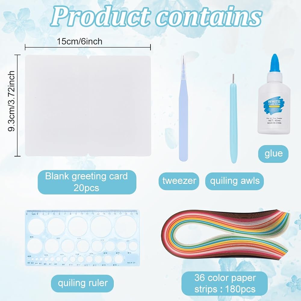 Mandala Paper Quilling Kit: Our quilling kit includes 36 colours paper strips, 20 blank cards, 1 slotted pen, 1 quilling ruler, 1 tweezer, 1 glue, instructions, giving almost every tools you need for DIY craft making.