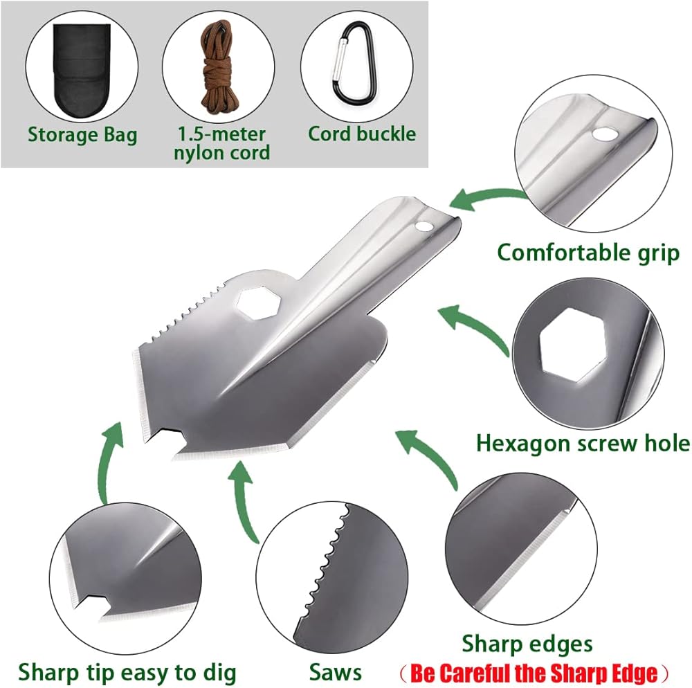 【أدوات متعددة 6 في 1】- تتضمن المجرفة العديد من الأدوات الخارجية المفيدة في أداة واحدة، بما في ذلك المنشار وفتحة مفتاح الربط والحواف الحادة لقطع الأرض الصلبة والجذور، مع ميزة أن الأدوات الأخرى لا يمكنها إنجاز المهمة بسرعة. يوجد أيضًا سلك نايلون بطول 1.5 متر ومشبك إغلاق لسهولة الحمل وأيضًا كحبل لتجميع الأشياء التي تحتاجها.