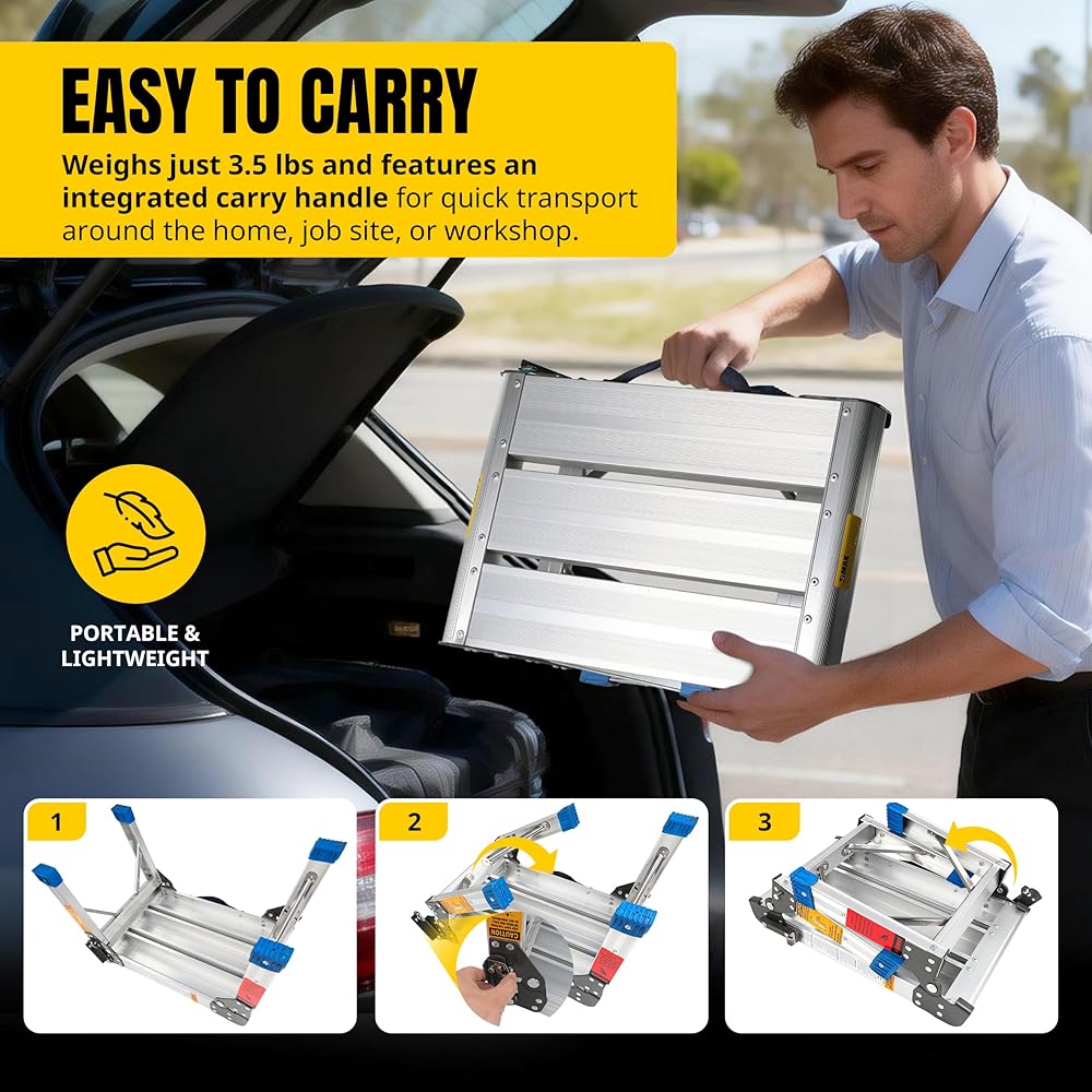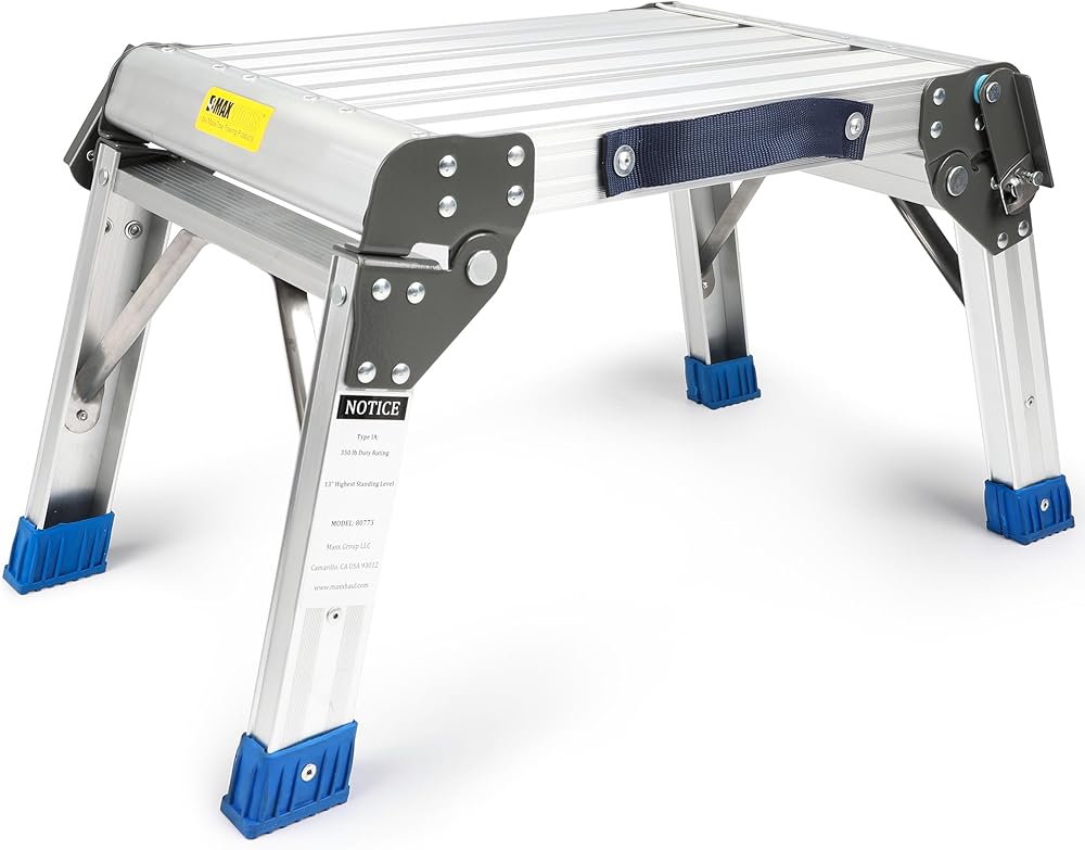 MaxWorks 50969 Home Folding Step Stool - a durable and versatile solution for your everyday needs. With built-in long nails for enhanced stability and a weight capacity of up to 330lbs, this stool is built to last. Its spacious surface and compact design make it perfect for any room or on-the-go use. Featuring a secure grip with rubber polka dots and anti-skid rubber bottom, along with rounded corners for added safety. Plus, weighing just 3.2 lbs and crafted from high-quality materials, it's both lightweight and durable. Elevate your tasks with ease and convenience with the MaxWorks Folding Step Stool.
