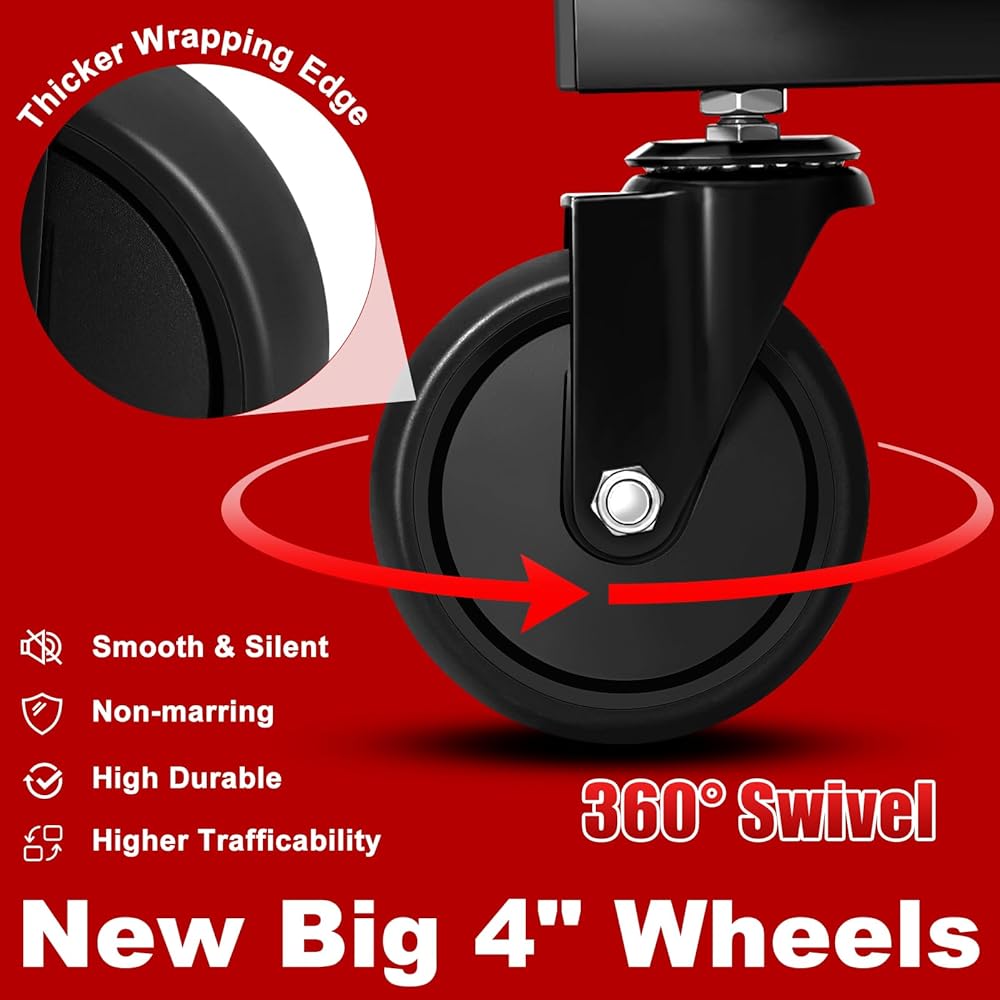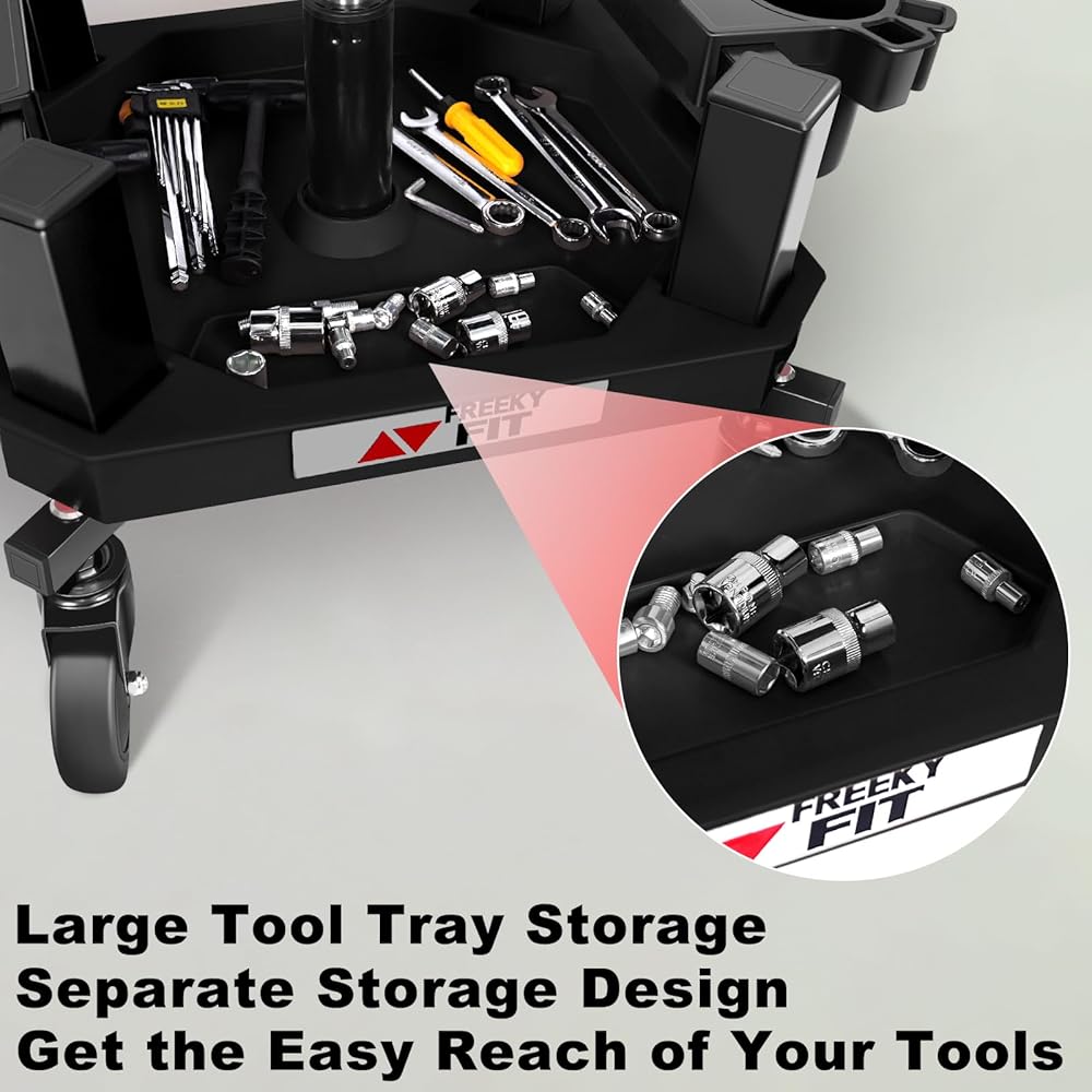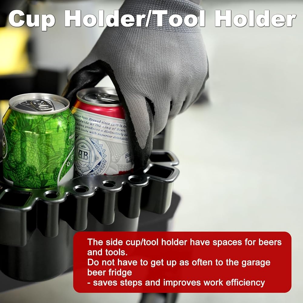 【صينية أدوات واحدة وحاملي أكواب/حاملي أدوات】يتميز مقعد المرآب بوظيفة تخزين جيدة جدًا. يوجد صينية أدوات وحاملي أكواب/حاملي أدوات. وفي الوقت نفسه، تم تجهيز درج الأدوات بمساحة قسم صغيرة. يمكنك وضع أدوات صغيرة مثل البراغي هنا. عندما تتحرك، لا تقلق بشأن انزلاق البراغي خارج النطاق. من السهل تخزين الأدوات والأجزاء الضرورية والوصول إليها في أي وقت