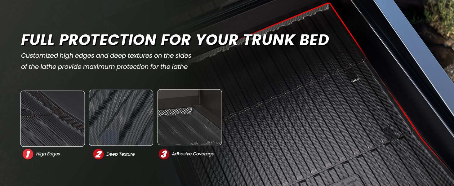 • مقاومة للانزلاق وحماية من جميع الأحوال الجوية - يضمن نسيج السطح غير القابل للانزلاق بقاء الحمولة آمنة وعدم الانزلاق. يمكن تثبيت بطانة السرير بشكل محكم لمنع البضائع من التحرك أو الطيران أثناء السفر، مما يضمن سلامة القيادة. بالإضافة إلى ذلك، توفر سجادة البضائع حماية إضافية للركبتين عند تحميل وتفريغ البضائع، مما يضمن سهولة الاستخدام والسلامة. تعمل سجادة أرضية Tesla Cybertruck على حماية سيارتك من الأوساخ والطين والملح والمطر والثلج والرمال ودرجات حرارة الصيف الحارة، مما يوفر حماية في جميع الأحوال الجوية