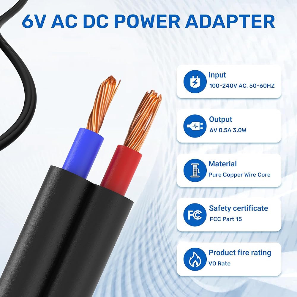 [Charger Parameters] Input AC 100V-240V 50/60Hz/Output DC 6V-0.5A, 3.0W/ 6 Ft Power Cable/180mm * 5.5mm Center Positive Barrel Plug