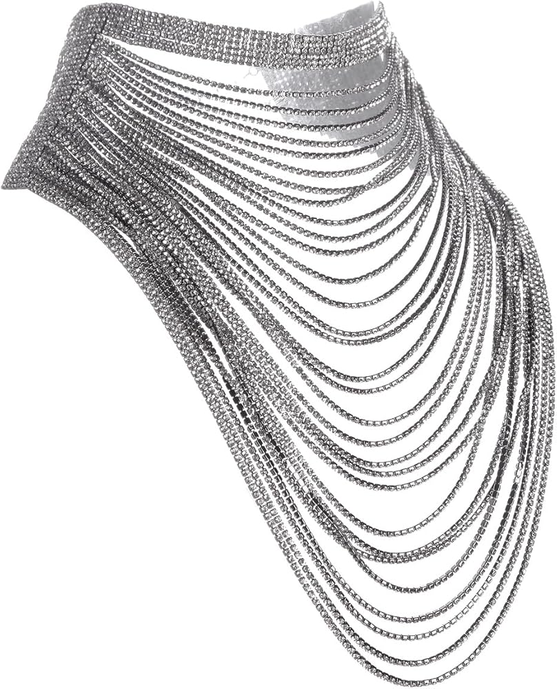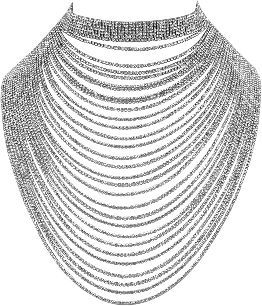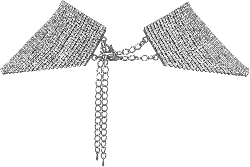 هذه القلادة الرائعة من أحجار الراين الكريستالية الزجاجية الشفافة والموجودة في تصميم قلادة مستديرة مصقولة تتمتع بإحساس عتيق مع تفاصيلها المتدلية من الكريستال المعقد. يبلغ عرض القلادة الواسعة للغاية المغطاة بأحجار الراين 7.62 سم على الجوانب وتنقسم إلى 30 خصلة من الكريستال ذي الأوجه تتدلى بطول 12 بوصة! تم تصميم القلادة لوضعها على الرقبة أو الترقوة العالية لملاءمة مريحة وشخصية.