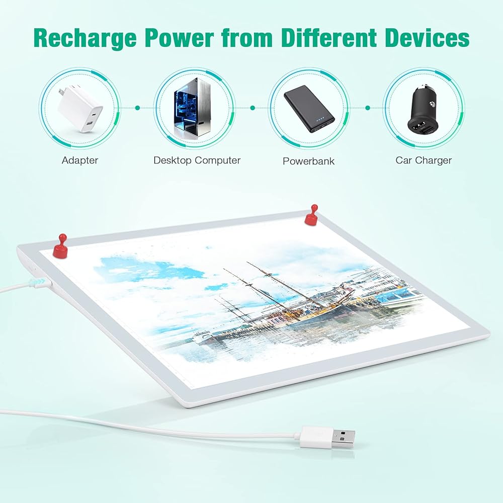 نحيف ومحمول: يمكن لصندوق تتبع الضوء اللاسلكي أن يستوعب الورق بحجم يصل إلى A4، كما أن تصميمه النحيف يجعل من السهل حمله في الخارج. التصميم الرفيع للغاية وخفيف الوزن مع مقياس على الحدود سيجعل من السهل على الحرف اليدوية التخلص من الأعشاب والرسم والرسم.
