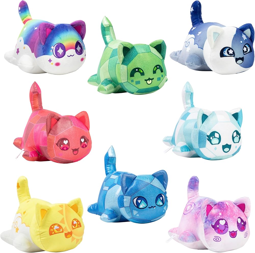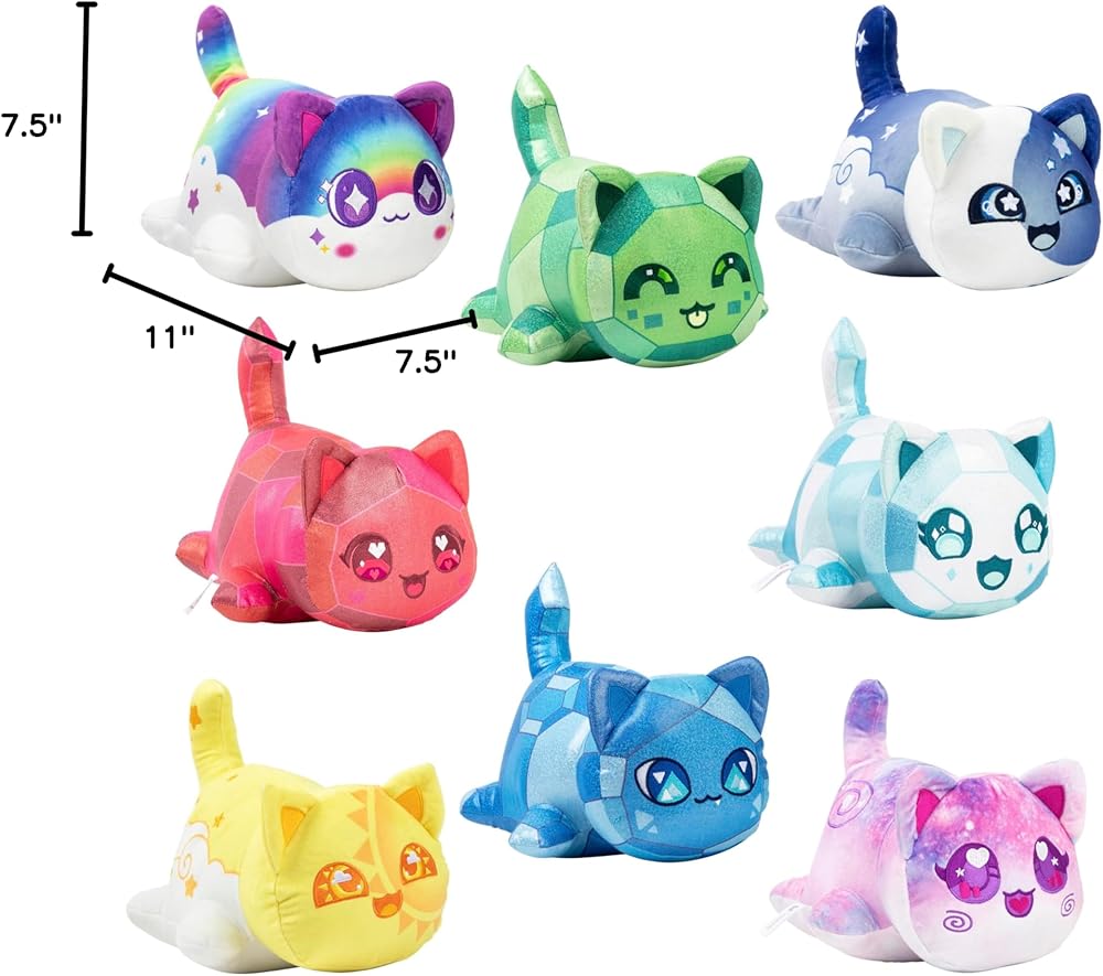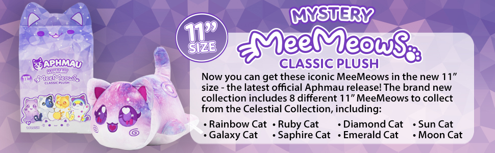 • COLLECT THEM ALL: This first release of 11” plush includes 8 MeeMeows from the Celestial Collection: Rainbow Cat, Galaxy Cat, Diamond Cat, and Ruby Cat. There is a whole world of official Aphmau MeeMeow plush to collect!